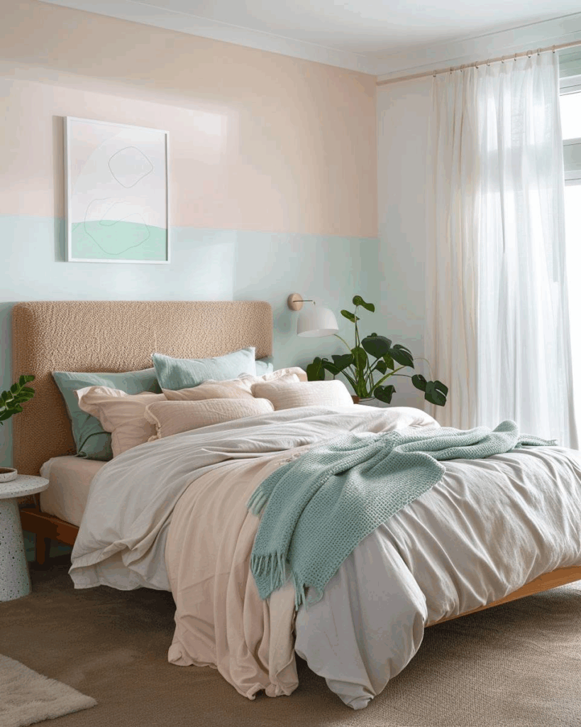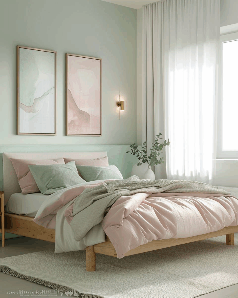 Verbinde Mintgrün und Rosé für Ruhe. Wandfarbe ist zartes Mintgrün in matt, Bettwäsche ist weiches Rosé aus Leinen. Wir empfehlen dir Dekokissen in Rosé und Mintgrün, Vorhänge sind weiß und luftig. Akzente sind warmes Holz und Messing. Licht ist warmweiß mit 2700 K.