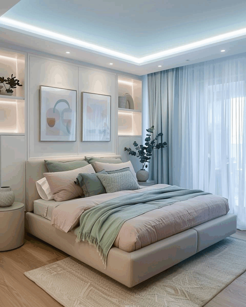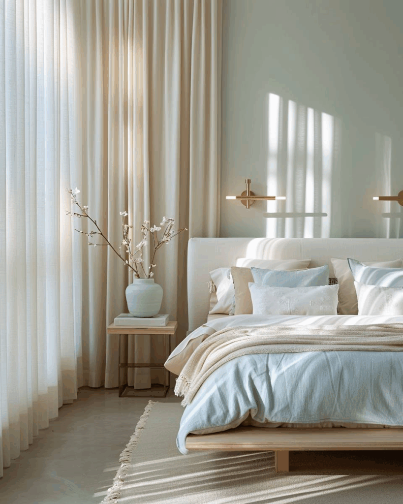 Mach den Look ruhig mit viel Weißraum. Wir setzen auf weiße Wände als Basis für Pastellfarben. Du lässt große Abstände zwischen Möbeln, hältst Wände frei und blockierst kein Tageslicht. Leichte Vorhänge, Bettwäsche aus Leinen und ein kleiner Teppich sind genug.
