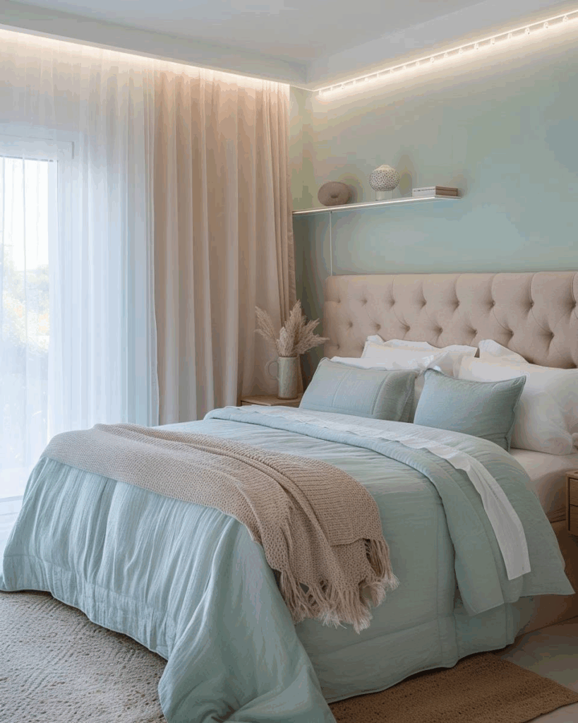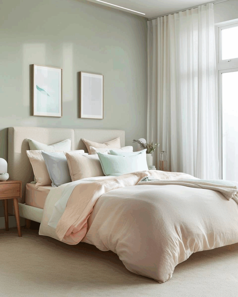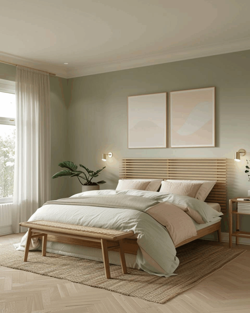 Betone das Bettkopfteil in sanftem Salbeigrün