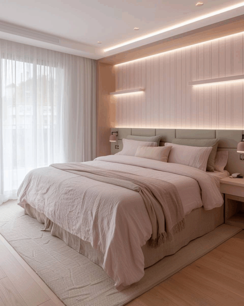 Mach das Kopfteil in sanftem Salbeigrün zum Blickfang. Der Bezug ist Leinen und wirkt ruhig und weich. Die Wand ist Warmweiß; wir kombinieren cremefarbene Bettwäsche ohne Muster. Wir setzen Messing an Wandleuchten und Griffen für Wärme. Dein Licht ist 2700K und lässt den Ton sanft wirken.