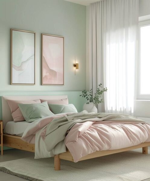 Verbinde Mintgrün und Rosé für Ruhe. Wandfarbe ist zartes Mintgrün in matt, Bettwäsche ist weiches Rosé aus Leinen. Wir empfehlen dir Dekokissen in Rosé und Mintgrün, Vorhänge sind weiß und luftig. Akzente sind warmes Holz und Messing. Licht ist warmweiß mit 2700 K.
