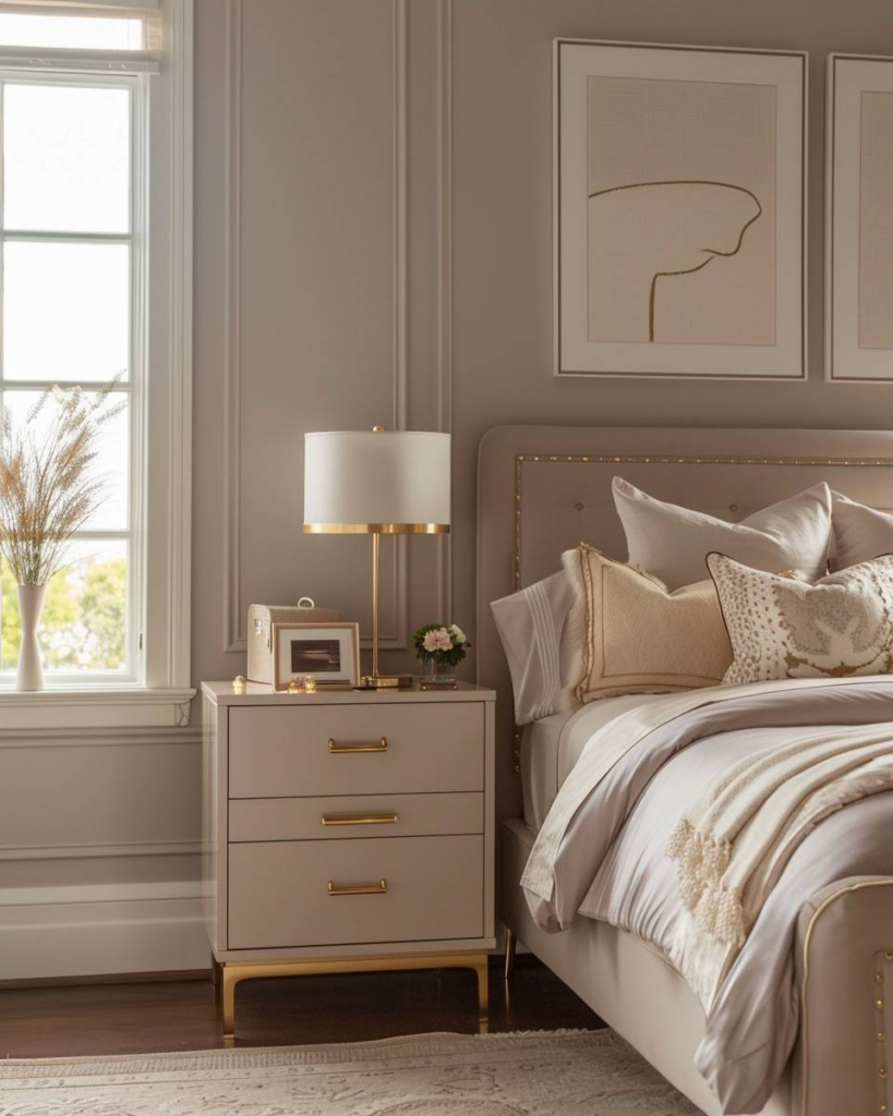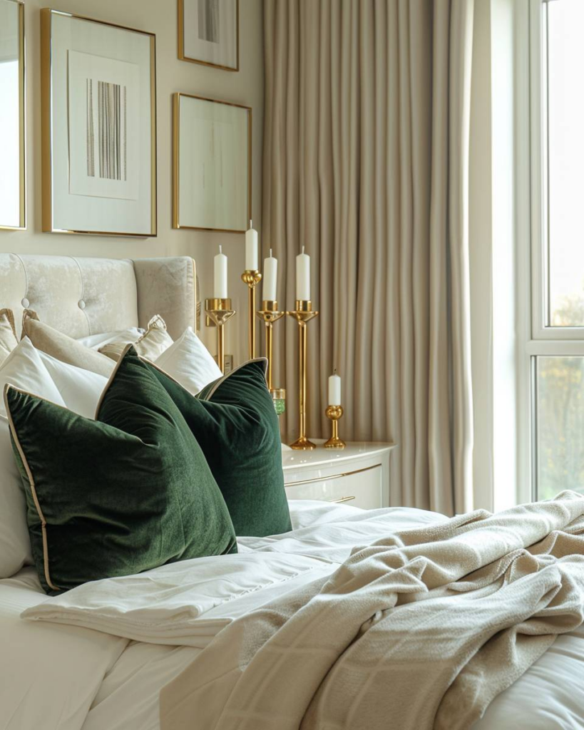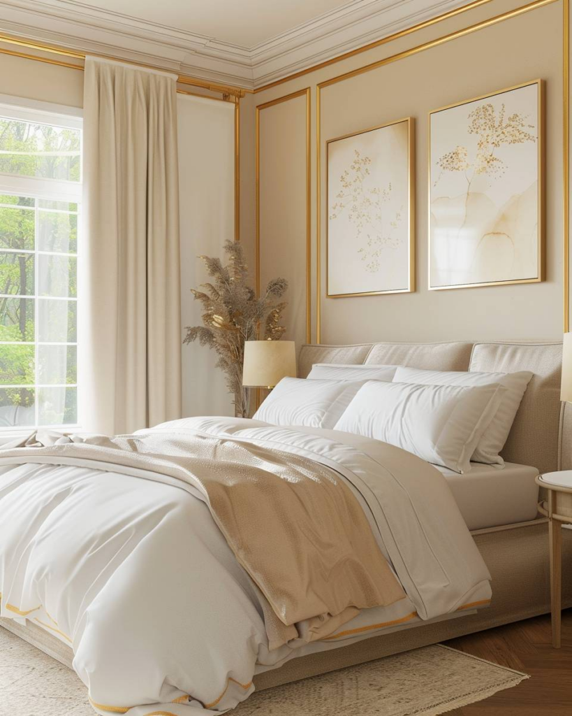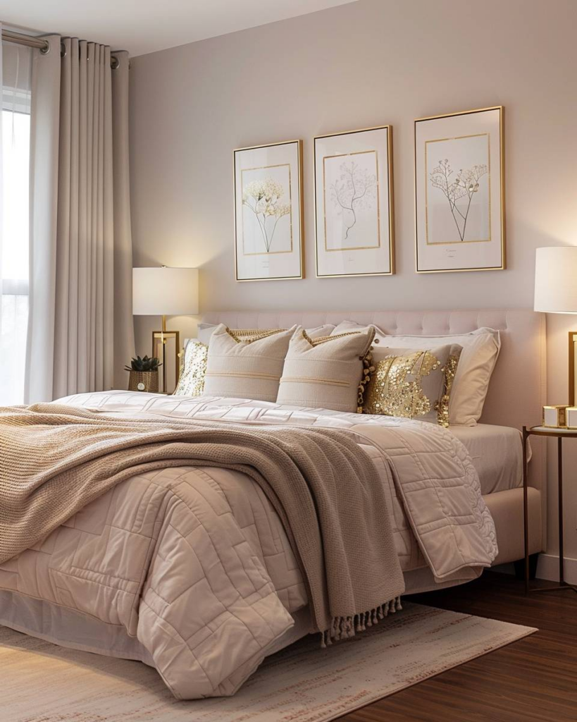 Wir setzen goldene Akzente mit Kissenbezügen, integrieren eine goldfarbene Leselampe am Bett und wählen Wandbilder mit zarten Goldrahmen.