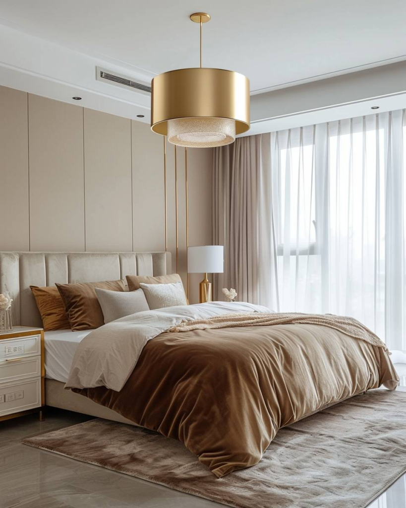 Bringe eine goldene Pendelleuchte über deinem Bett oder Nachttisch an. Gold sorgt für Wärme und Eleganz im Schlafzimmer. Sanftes Licht schafft Gemütlichkeit. Eine moderne Form hält den Look frisch. Wir kombinieren sie mit neutralen Wandfarben für einen ruhigen Raum.