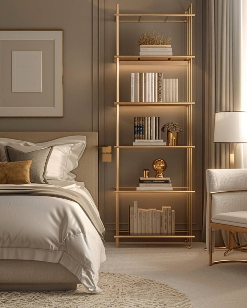 Bücher auf goldenen Wandregalen wirken als stilvolle Highlights. Kombiniere schlichte Buchumschläge mit dekorativen Objekten. Achte auf eine aufgeräumte Reihenfolge. So bringst du Glanz und Gemütlichkeit ins Schlafzimmer.