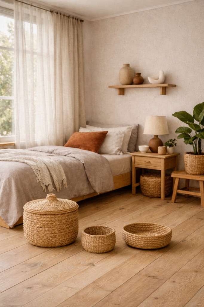 Arrangiere Körbe aus Seegras zur Aufbewahrung