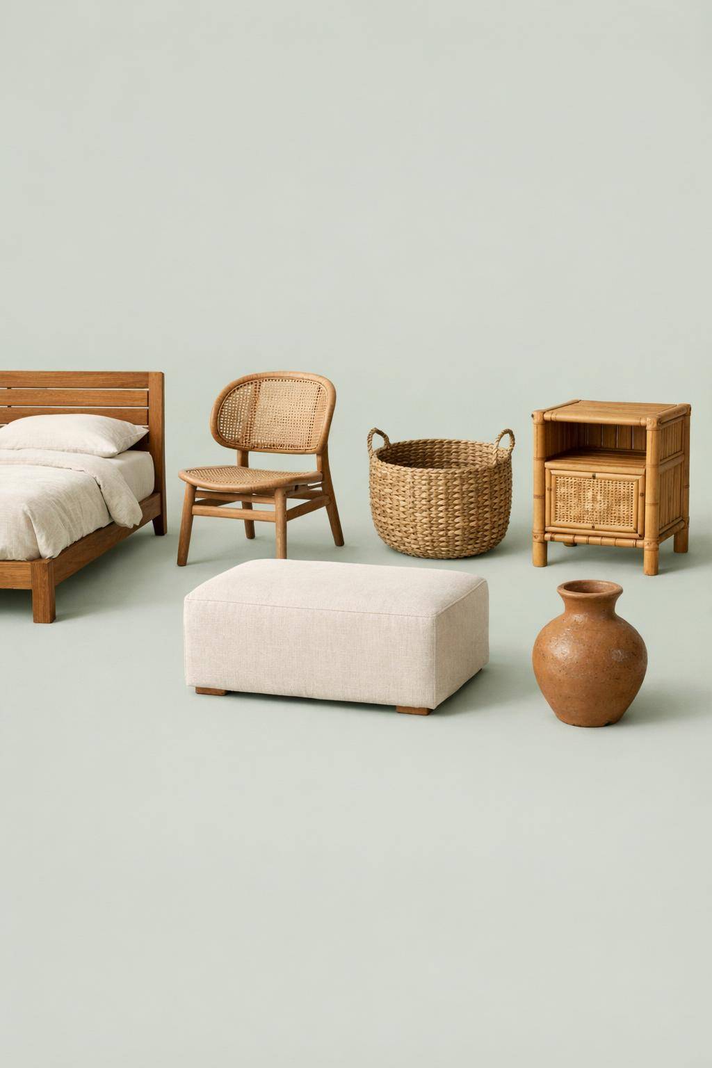 Positioniere einen gewebten Teppich aus Jute vor dem Bett