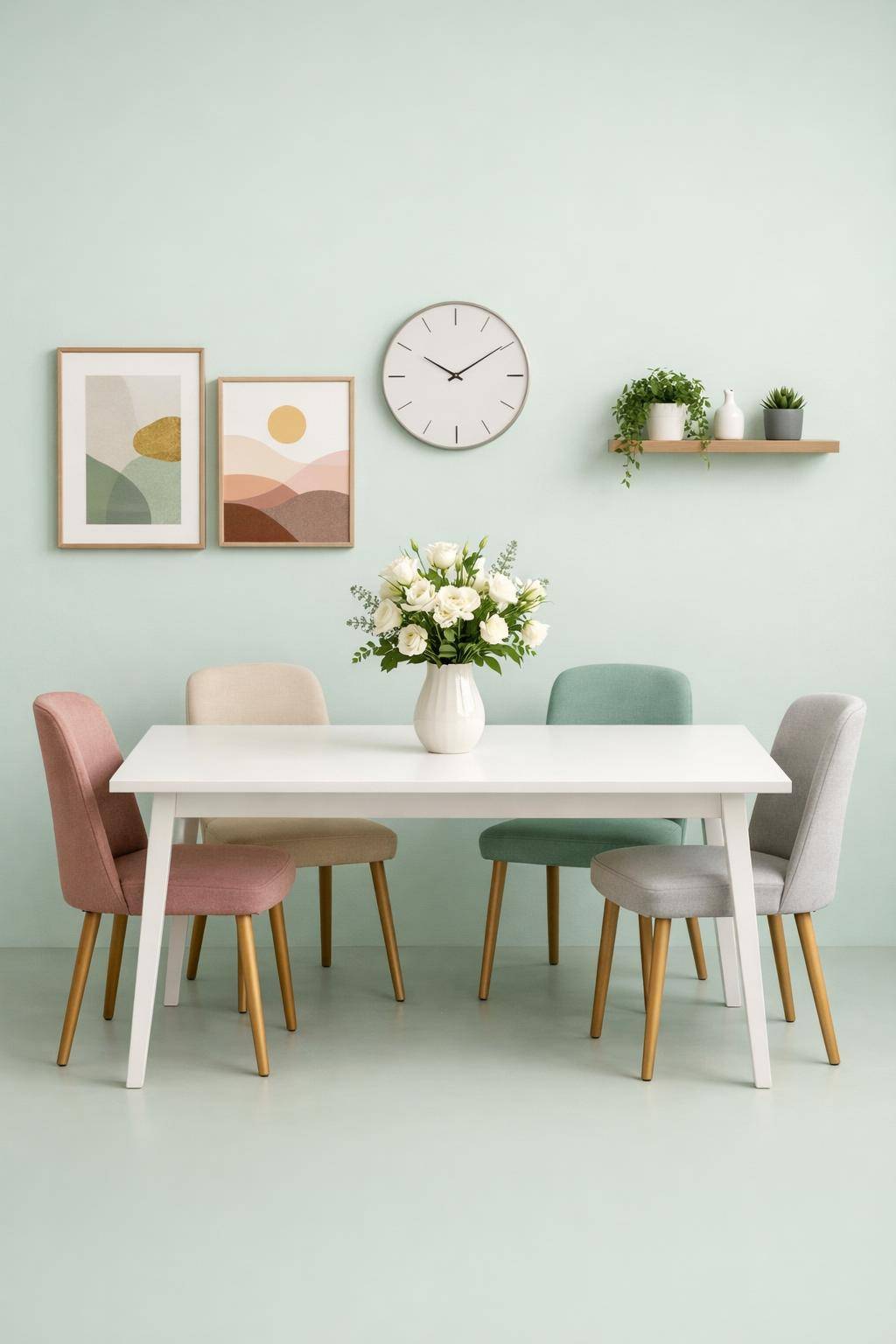 Wechsele die Wanddekoration im Esszimmer mit den Jahreszeiten. Wir hängen farblich passende Bilder, Trockenblumen oder Poster auf. Im Frühling passen zarte Pflanzenmotive, im Winter warme Holzrahmen oder Kerzenhalter gut. Wir sorgen so immer für frische Stimmung am Esstisch.