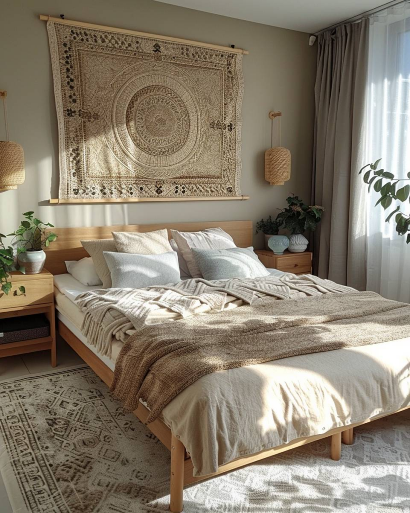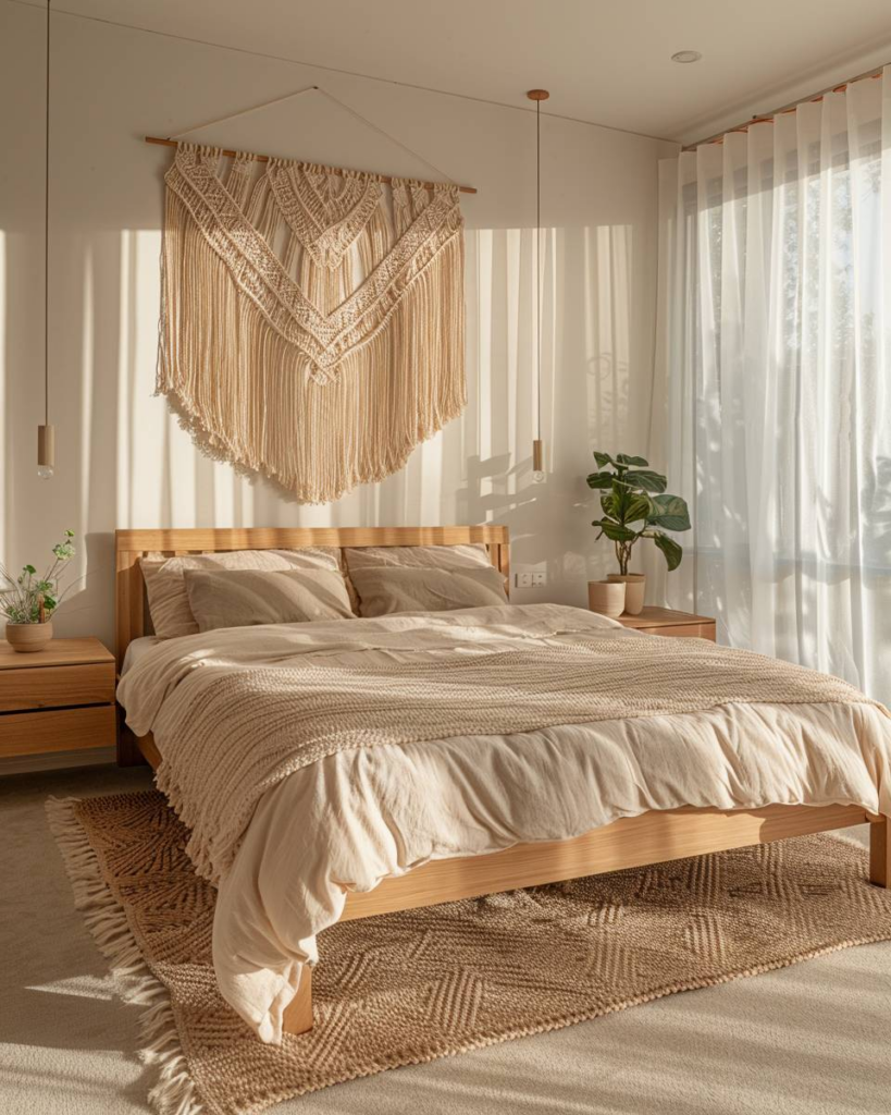 Setze Makramee-Wandbehänge ein, um deinem Schlafzimmer ein Boho-Flair zu geben. Handgeknüpfte Muster bringen Textur an deine Wand und sorgen für Gemütlichkeit. Natürliche Materialien wie Baumwolle oder Jute wirken warm und passen zu Holz und Pflanzen. Wähle helle Töne oder Erdtöne, damit der Raum ruhig bleibt.