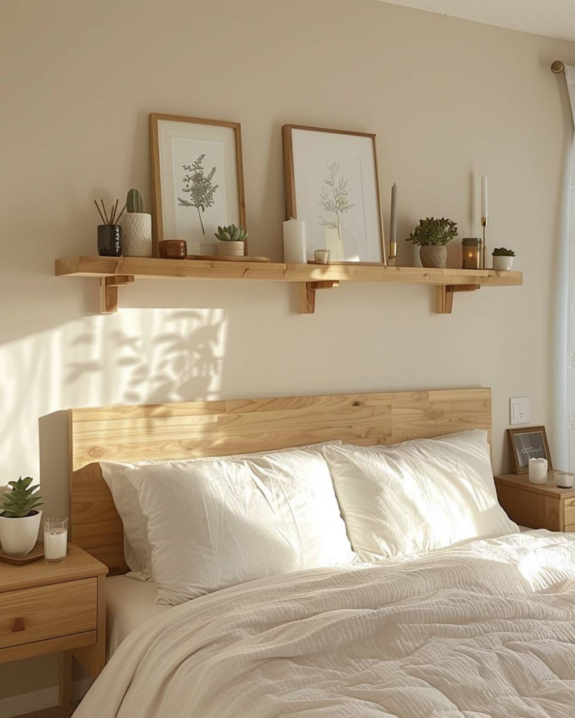 Bringe schwebende Regale direkt an der Wand an. Wir nutzen feste Dübel und eine Wasserwaage, damit sie sicher und gerade sind. Auf kleinen Ablagen platzieren wir leichte Deko-Objekte wie Kerzen, kleine Vasen oder Bilderrahmen. Offene Flächen helfen uns, den Raum aufgeräumt zu halten.
