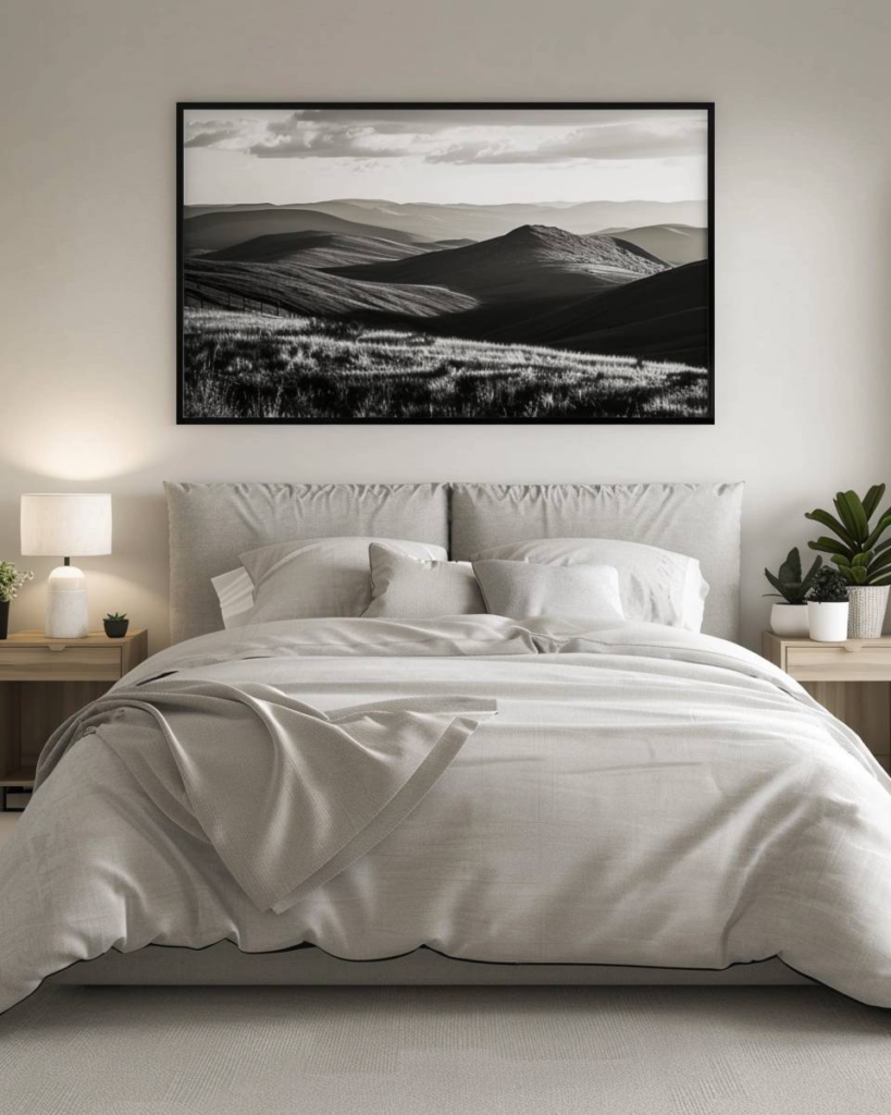 Gestalte eine große Schwarz-Weiß-Fotografie für deine Schlafzimmerwand. Wähle ein Motiv, das dich inspiriert. Nutze einen hochwertigen Druck und passe das Format exakt an deine Wand an. Ein schlichter Rahmen bringt das Bild zur Geltung.