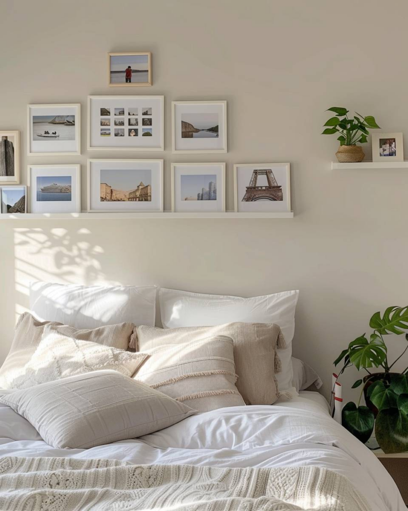 Erinnere dich mit einer Fotowand im Schlafzimmer an schöne Momente. Nutze Bilderrahmen, schlichte Posterleisten oder Klebefilm und ordne die Fotos als Collage oder in Reihen an. Lasse genug Platz zwischen den Aufnahmen, damit jede Erinnerung wirkt. Entscheide dich für Fotos, Postkarten oder kleine Andenken, die dir Freude bringen. Mit einer Lichterkette erzeugst du ein gemütliches Licht.