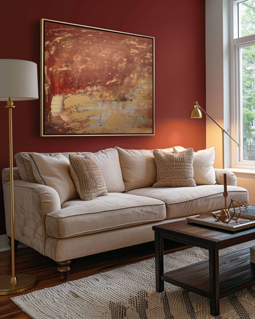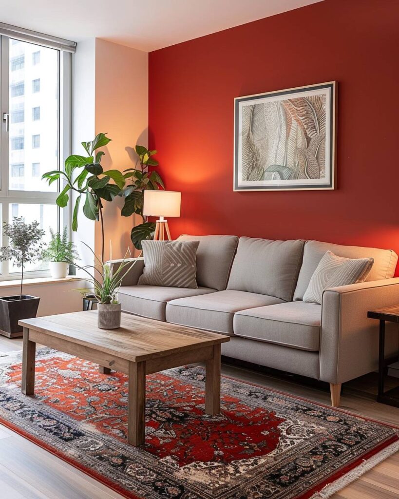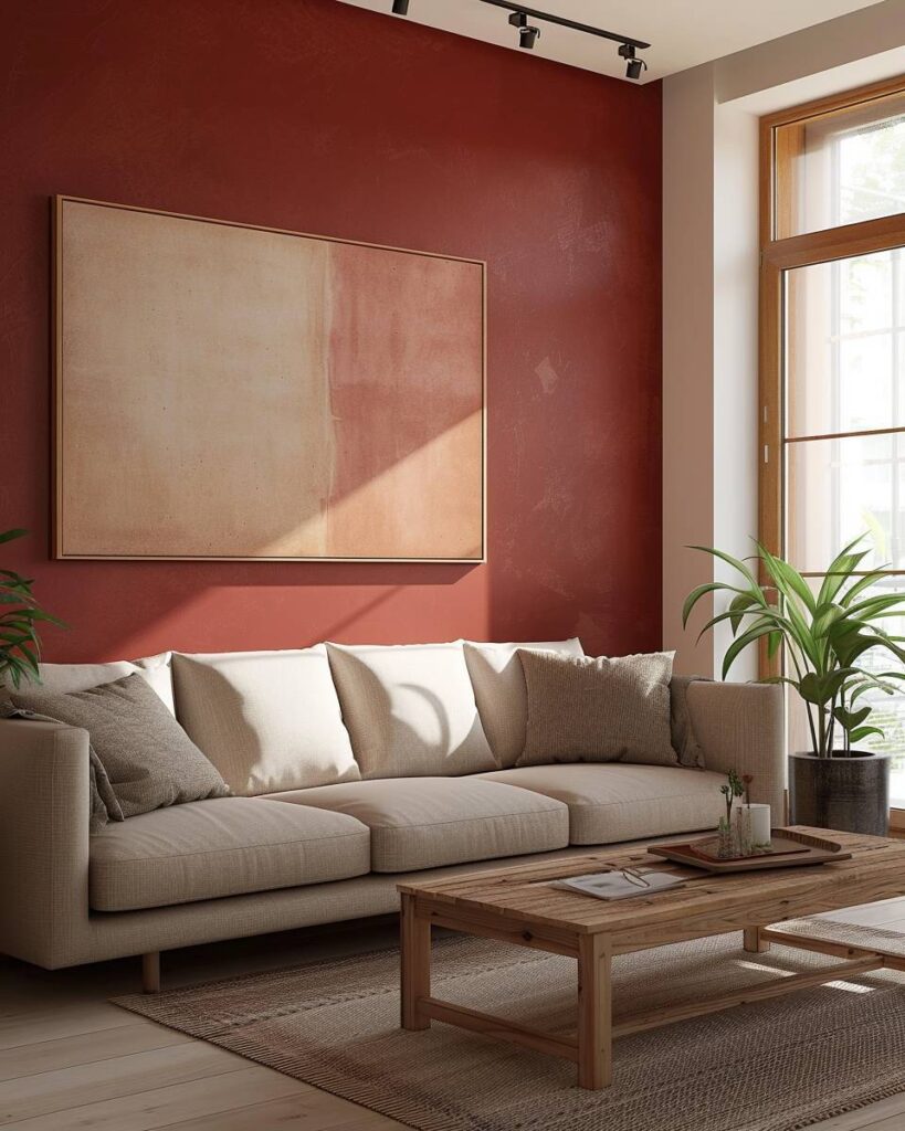 Greif zu einem warmen, tiefen Rot wie Bordeaux oder Terrakotta. Solche Töne wirken ruhig, edel und bringen Gemütlichkeit in den Raum. Achte darauf, dass das Rot einen braunen oder erdigen Unterton hat – das macht es wärmer und harmonischer. Kombiniere es mit neutralen Farben wie Creme oder Grau, damit der Raum nicht zu dunkel wirkt.
