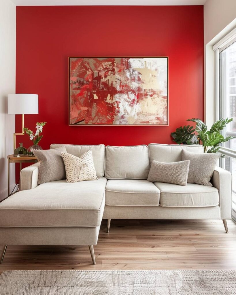 Wähle Rot und sanftes Beige, wenn du Wärme und Ruhe verbinden willst. Beigefarbene Wände mildern die Kraft von kräftigem Rot und bringen Balance in den Raum. Rote Akzente wie ein Sofa oder Teppich setzen starke Highlights. So wirkt der Raum lebendig, aber nicht zu laut.
