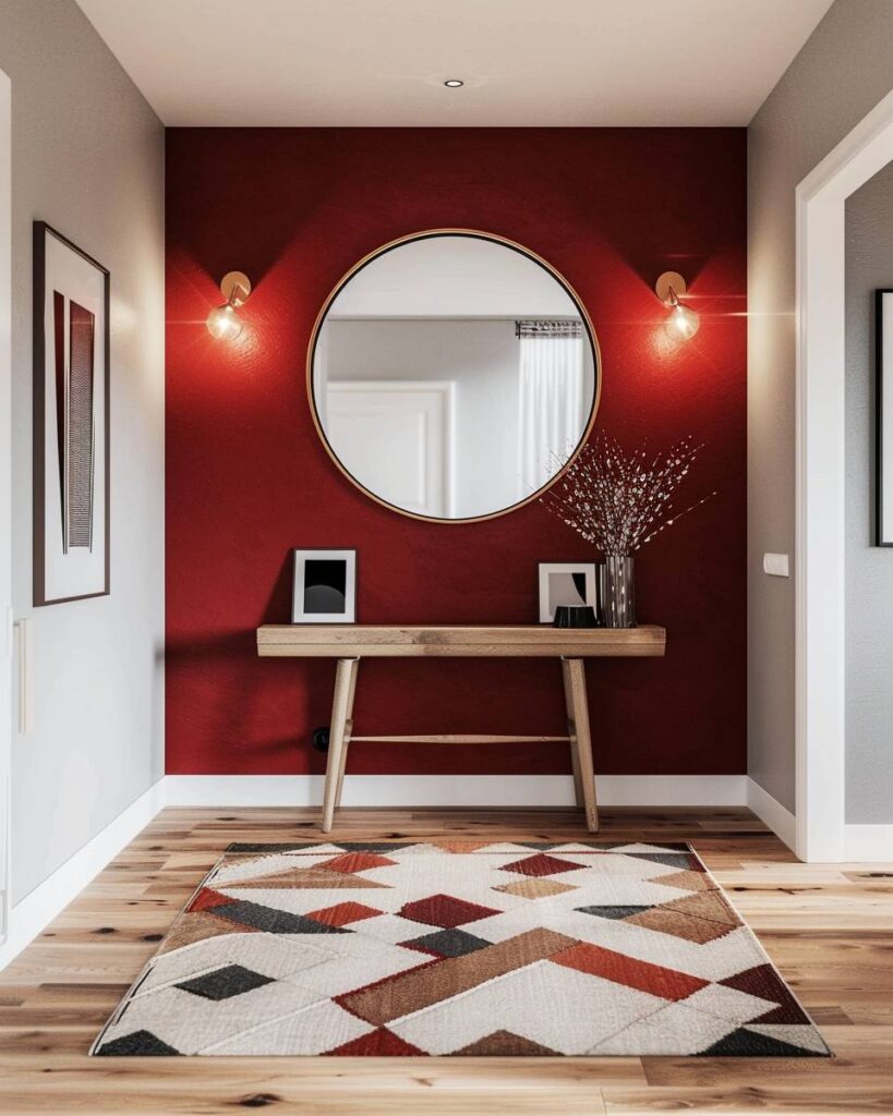 Setz auf kräftiges Rot im Eingangsbereich, um direkt Spannung zu erzeugen. Eine rote Wand hinter der Garderobe oder am Ende des Flurs zieht sofort Blicke an. Kombinier sie mit hellen Möbeln und neutralem Boden, damit der Raum nicht drückt. Gutes Licht macht den Ton lebendig und hält den Flur freundlich. Halte die restliche Deko schlicht, so bleibt der Fokus auf der Farbe.