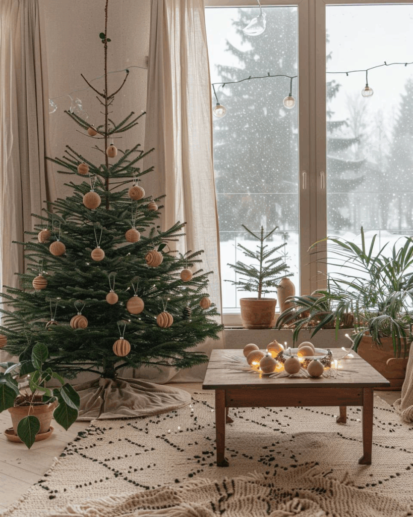 Du kannst den Baum mit getrockneten Orangenscheiben schmücken, nachhaltige Holzornamente für einen natürlichen Look wählen oder ihn mit warmweißen Lichterketten beleuchten.