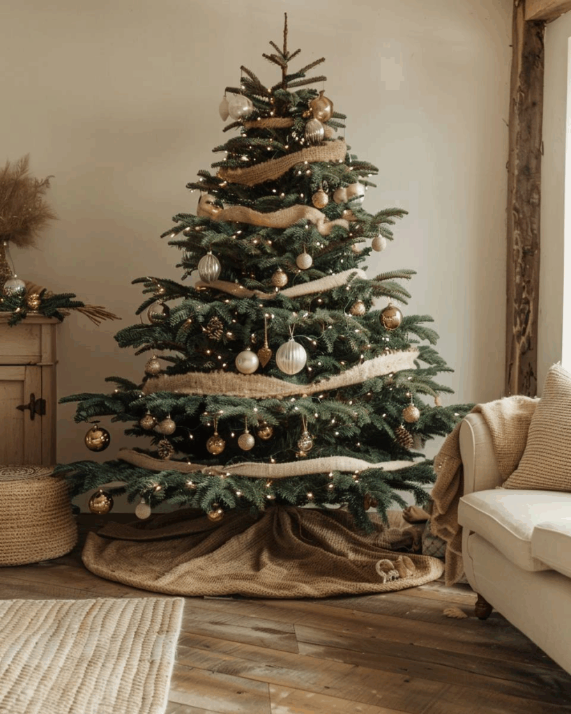 Nutze grobe Jute-Bänder, um deinem Weihnachtsbaum ein echtes Landhaus-Flair zu geben. Wir wickeln die Bänder locker um die Äste. Natürliche Farben und grobe Struktur betonen den ländlichen Look. Kombiniere die Bänder mit Holzschmuck und Tannenzapfen für ein stimmiges Bild. Dein Baum wirkt so warm und einladend.