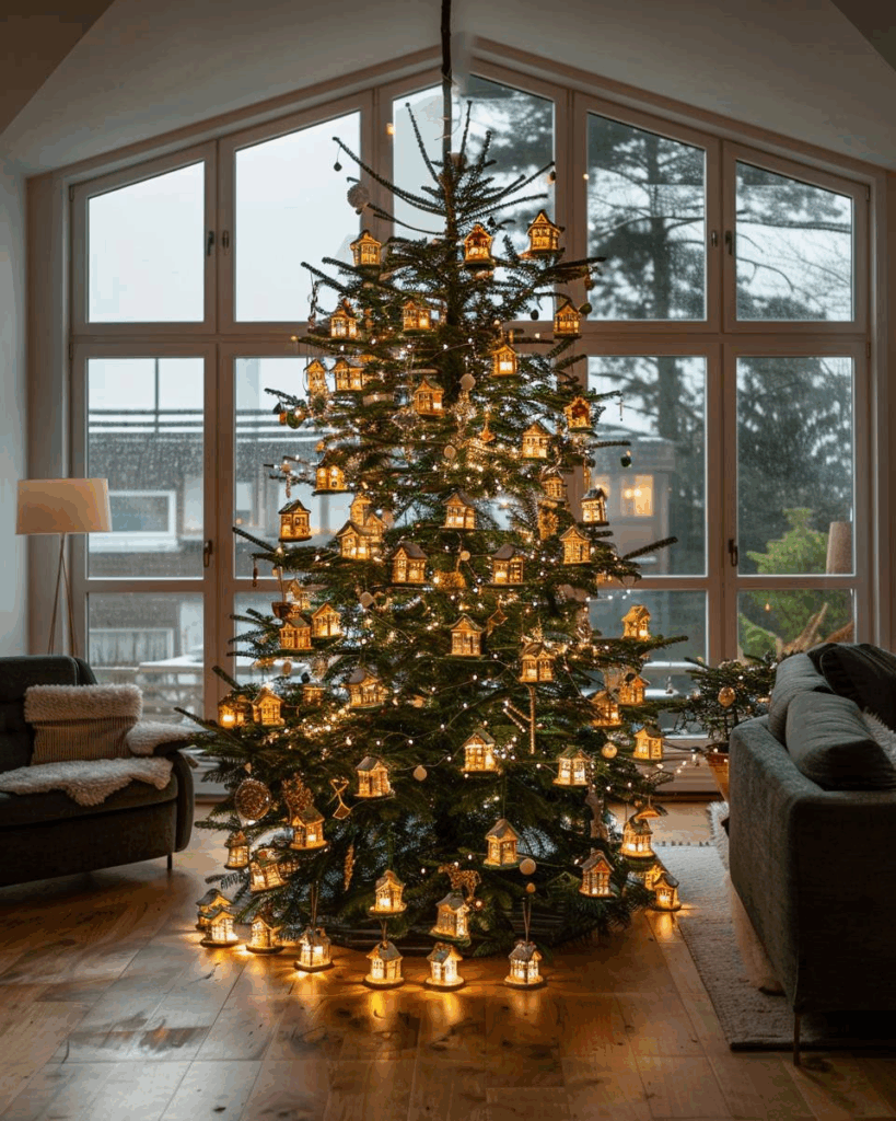 Mini-Lichterhäuser in den Baum zu hängen bringt verspieltes Licht in die Äste. Wir verteilen die kleinen Häuser gut sichtbar zwischen den Zweigen. Die warmen Lichter geben dem Baum einen magischen und gemütlichen Look. Lichterhäuser und Äste lassen sich gut mit klassischen Glaskugeln und Holzfiguren kombinieren.