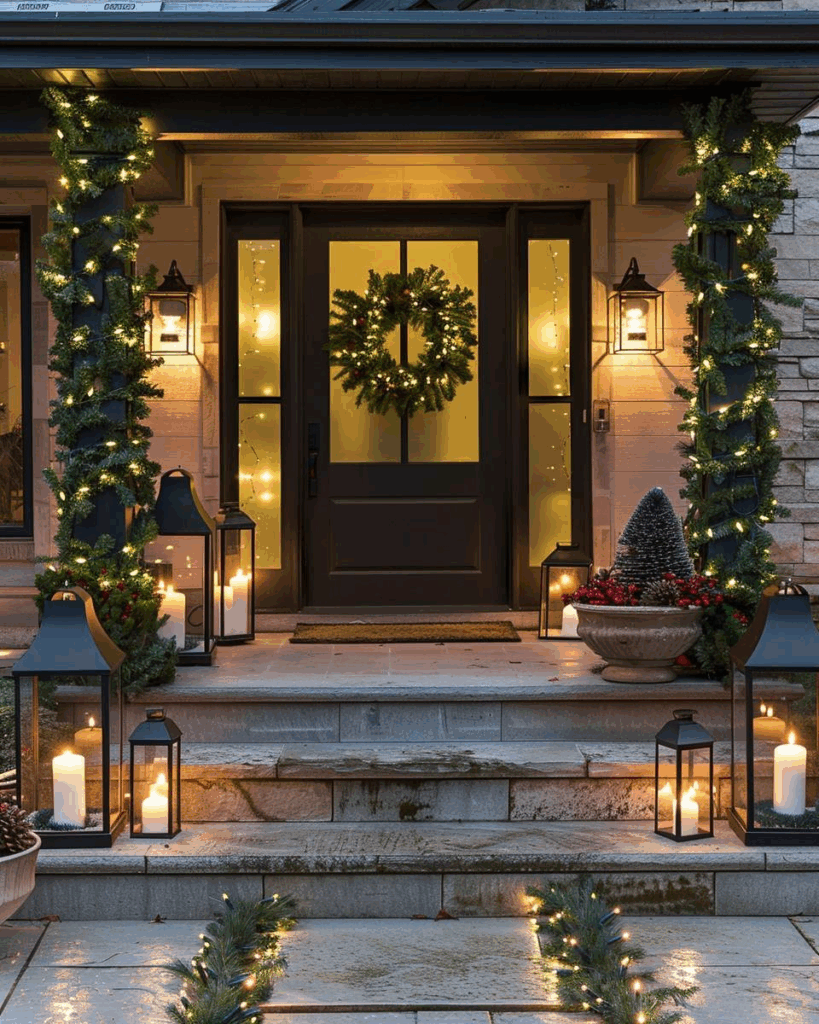 Lichterketten am Geländer, ein Naturkranz an der Tür und leuchtende Laternen auf der Treppe sind die beliebtesten Ideen, wenn du deinen Hauseingang stimmungsvoll einrichten willst.