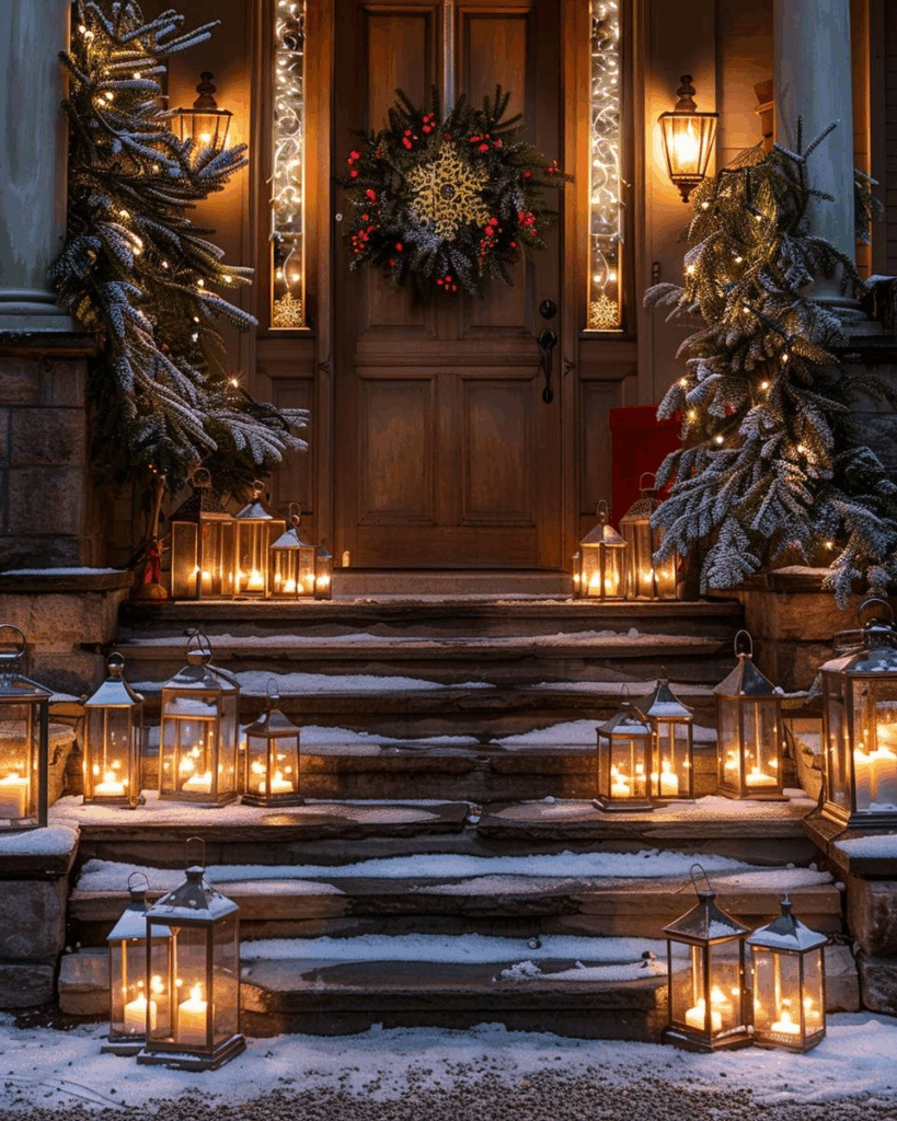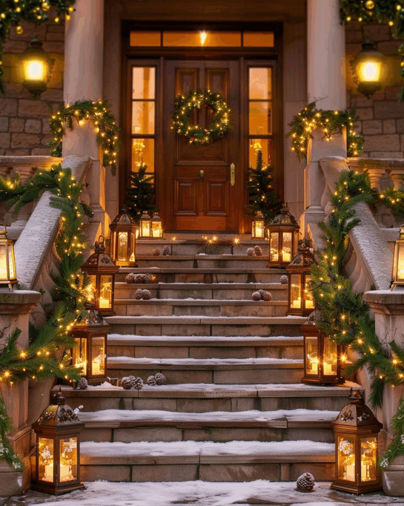 Stell leuchtende Laternen auf deine Treppe. Robuste Windlichter aus Glas oder Metall sind wetterfest und sicher. Warmweißes LED-Licht bringt Gemütlichkeit und Sichtbarkeit an dunklen Winterabenden. Platziere die Laternen versetzt auf den Stufen, damit du und deine Gäste den Weg klar erkennen.