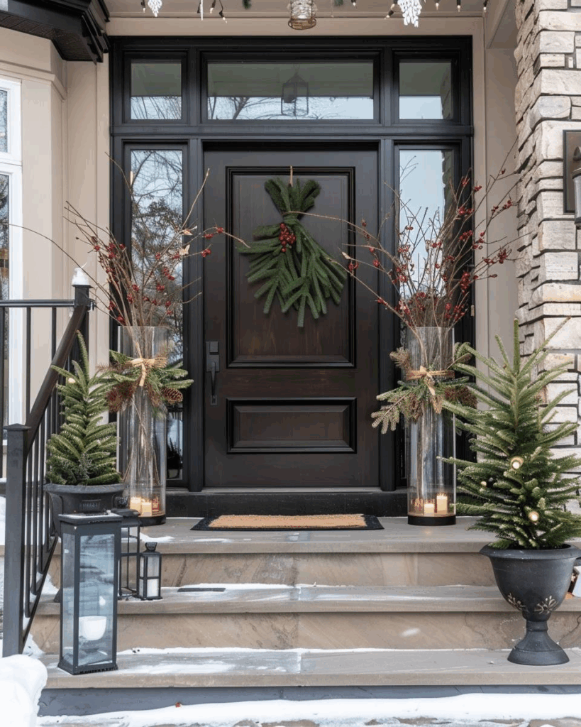 Stelle winterliche Zweige in schlichte Vasen. Zweige von Tanne, Eukalyptus oder Hagebutte sehen frisch und festlich aus. Stelle die Vasen geschützt neben die Haustür. Setze sie auf stabile Untersetzer. Kombiniere verschiedene Höhen.