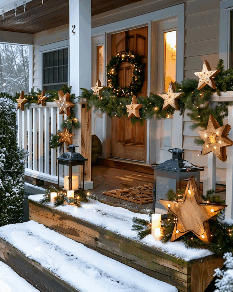Hänge selbstgemachte Holzsterne mit festem Band am Geländer auf. Holz ist wetterfest und bringt natürlichen Charme an deinen Eingang. Mit Lichterketten wirkt dein Geländer festlich und zieht alle Blicke auf sich.