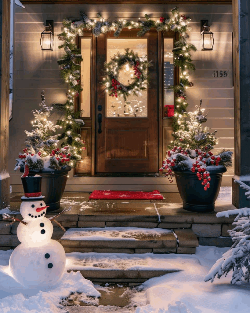 Setze einen freundlichen Schneemann an deinen Hauseingang. Wir nehmen weiße Schneekugeln, einen Hut, Kohleaugen, eine Karottennase und einen Schal. Stelle einen Eimer als Hut und Zweige als Arme auf. Mit einer Lichterkette bringst du Licht und Wärme vor die Tür. Der Schneemann begrüßt alle Gäste direkt und hebt die Stimmung.
