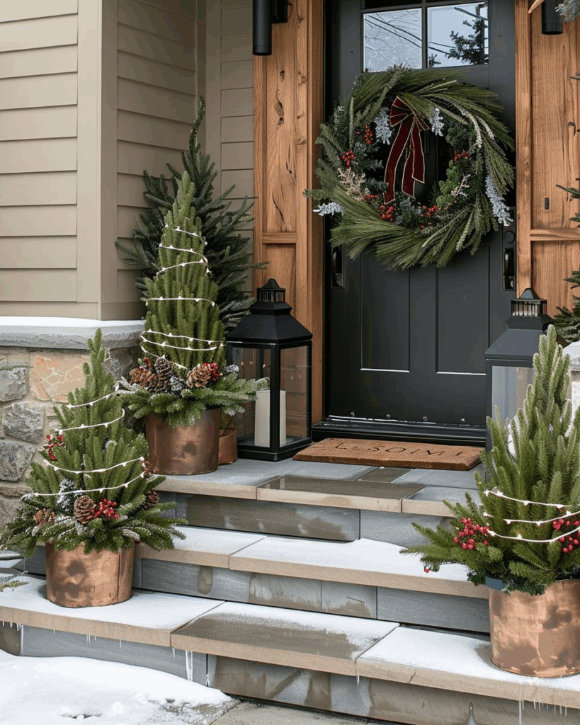 Setze kleine Tannen in Kübel direkt an deinen Hauseingang. Wähle frostfeste Gefäße mit Abflussloch. Bedecke die Wurzeln mit Erde und Rindenmulch. Gieße nur, wenn der Boden trocken ist. Schmücke sie mit Lichterketten oder Sternen für eine festliche Wirkung.