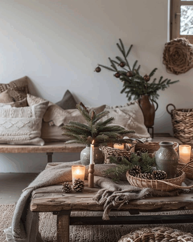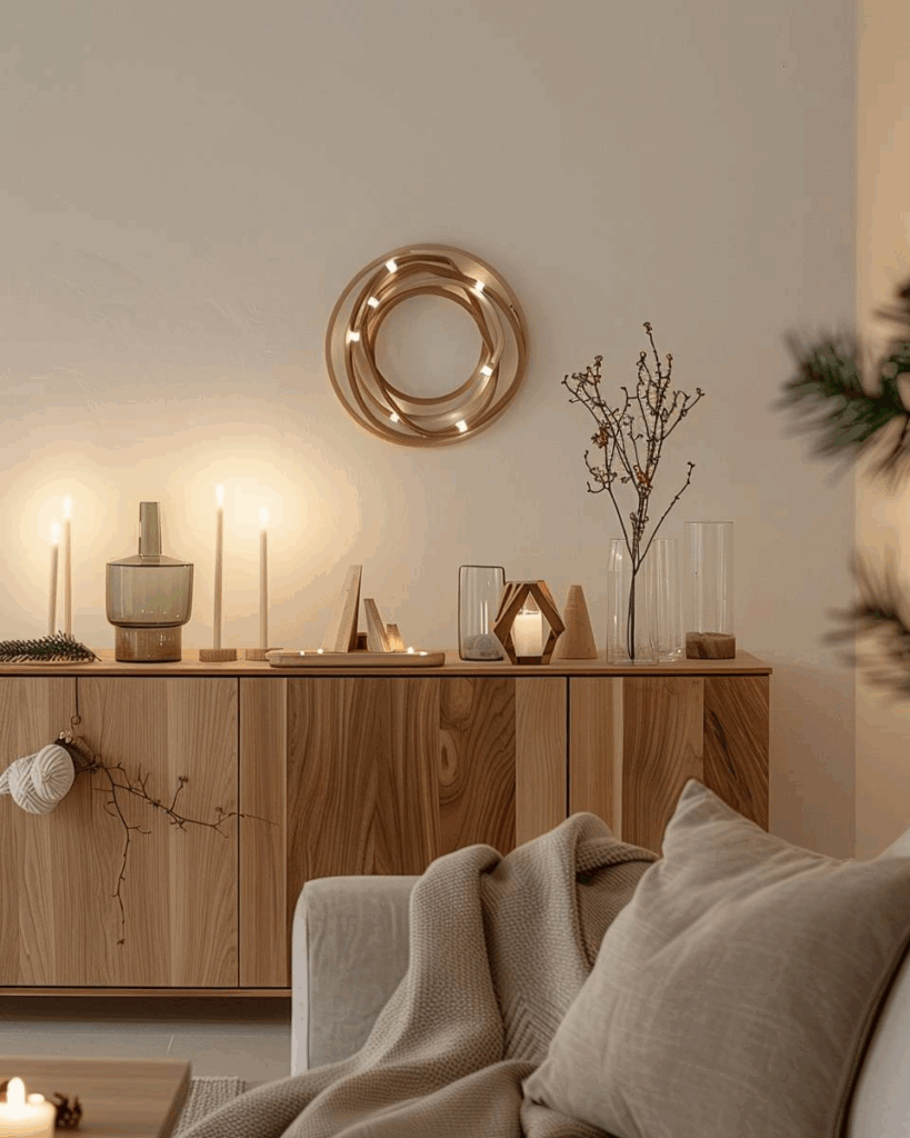 Setze auf schlichte Holzfiguren, kleine Kerzenhalter aus hellem Holz und klare Linien bei Holzsternen oder Bäumen. Wir lassen grelle Farben aus und bleiben bei naturbelassenen Oberflächen. Du schaffst so Ruhe und Wärme, ohne zu überladen. Kombiniere dazu nur wenige Deko-Elemente.