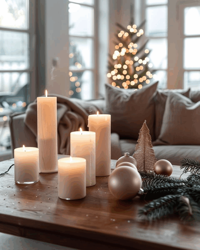 Wähle Kerzen in Pastellfarben wie Rosé, Mintgrün oder Hellblau. Sanfte Töne bringen Ruhe in dein Wohnzimmer. Kombiniere Kerzen mit Glaswindlichtern und Tannenzweigen. Pudrige Farben wirken modern und zeitlos. Setze farbige Kerzen gezielt als Hingucker auf deinen Tisch.