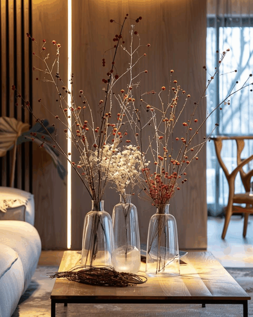 Schmücke Tannenzweige mit Trockenblumen und Beeren