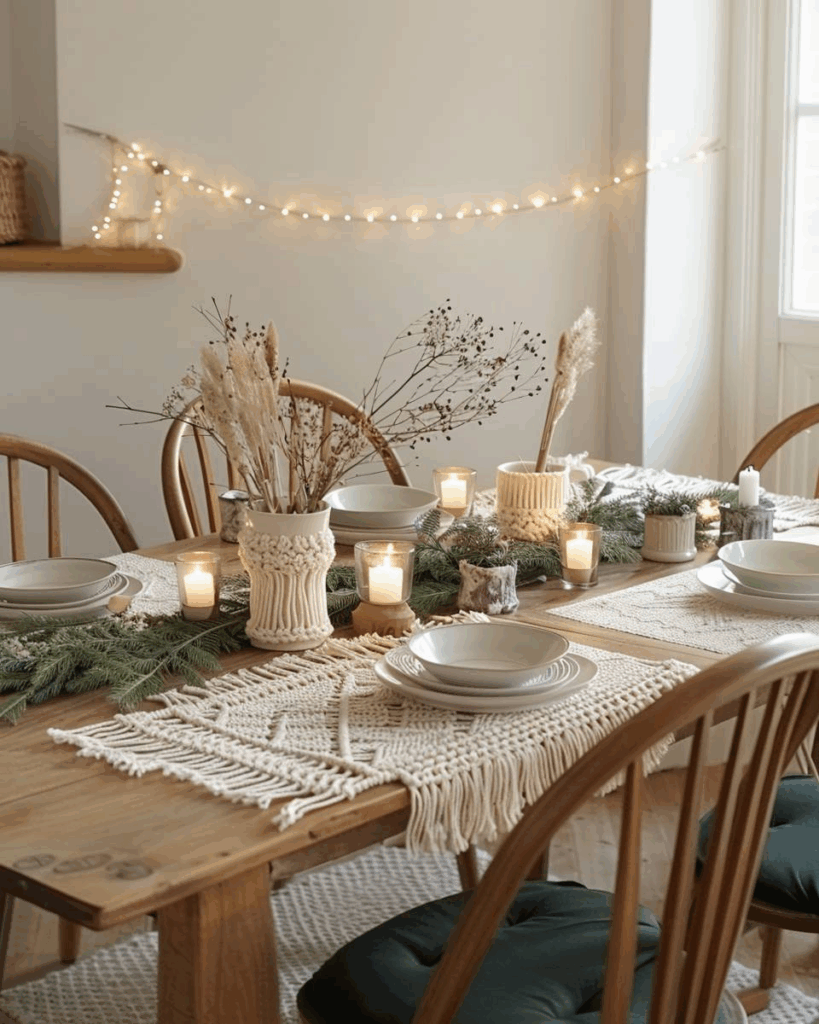 Lege Makramee-Tischläufer oder kleine Makramee-Untersetzer auf die Mitte des Esstischs. Kombiniere sie mit schlichten Kerzen und Tannenzweigen. So bringen wir mit natürlichen Materialien und weichen Strukturen Gemütlichkeit auf den Tisch. Baumwolle in Creme oder Beige passt perfekt zu jeder Weihnachtstafel.
