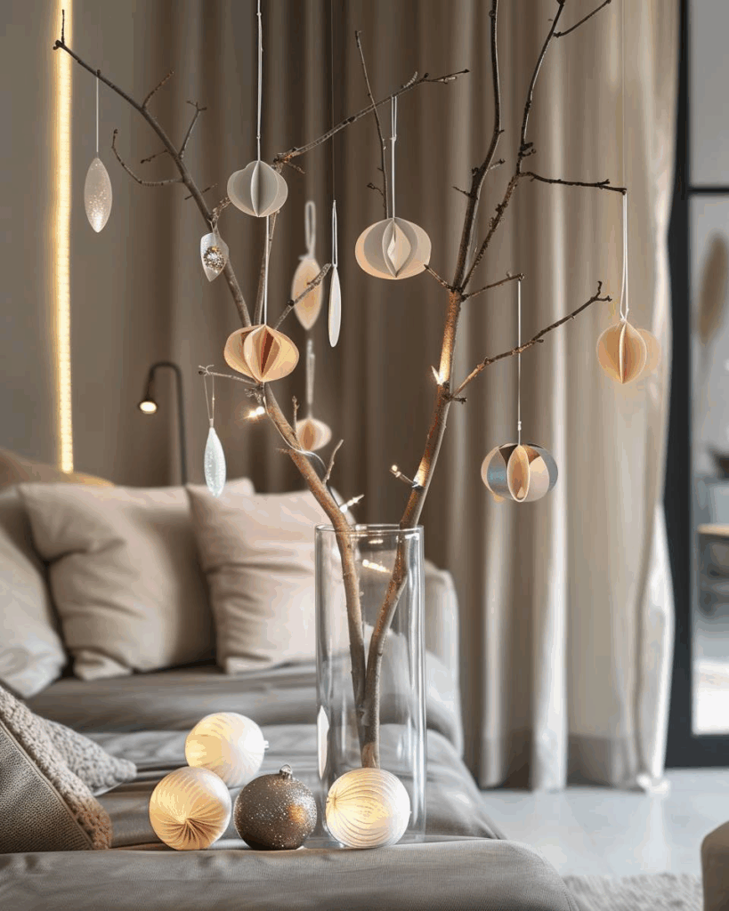 Platziere selbstgemachte Papierornamente an Zweigen im Raum. Du bringst Farbe und Leichtigkeit in deine Weihnachtsdeko. Bunte Faltsterne, Kugeln oder Herzen wirken modern und schlicht. Nutze kräftiges Papier und stabile Zweige für ein gutes Ergebnis. So schaffst du schnell einen trendigen Akzent.