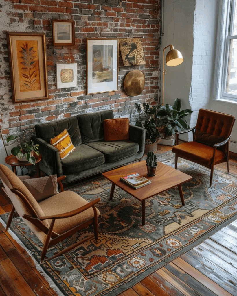 Vereine alte Fundstücke mit klaren Linien in deinem Raum. Farbpalette ist neutral mit Weiß, Schwarz und Naturtönen. Materialmix ist Holz, Messing, Glas und Stahl. Proportionen sind ausgewogen mit einem schweren Sideboard und einem schlanken Sofa. Licht ist warm und dimmbar, Texturen sind Leinen, Bouclé und glattes Leder.