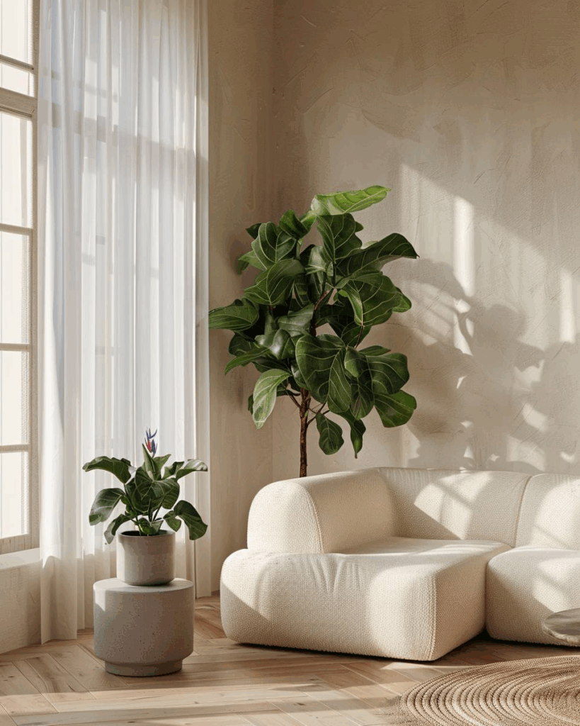 Mach Ecken lebendig mit großen Zimmerpflanzen. Monstera ist ideal für halbschattige Ecken und bringt Volumen. Ficus lyrata ist gut in hellen Ecken mit indirektem Licht. Kentia-Palme ist robust in dunklen Ecken und bringt Höhe. Stelle große Töpfe auf hohe Ständer, damit du Bodenfläche sparst.