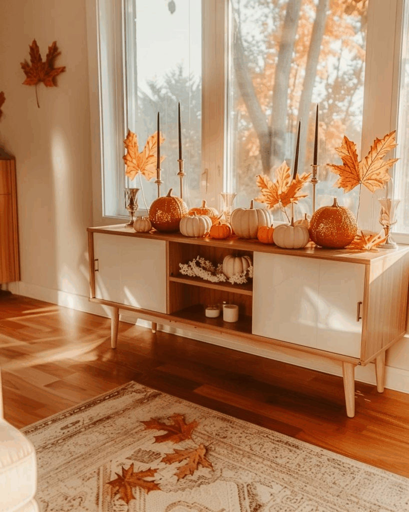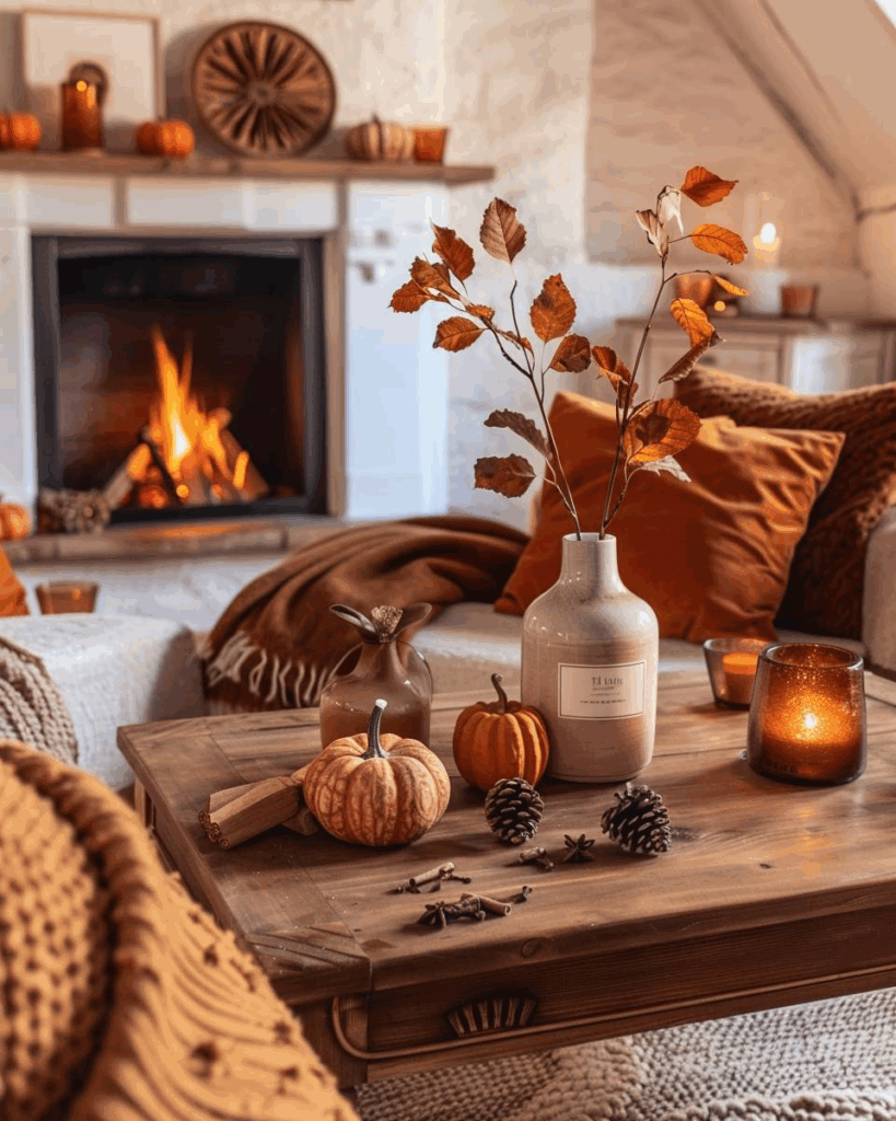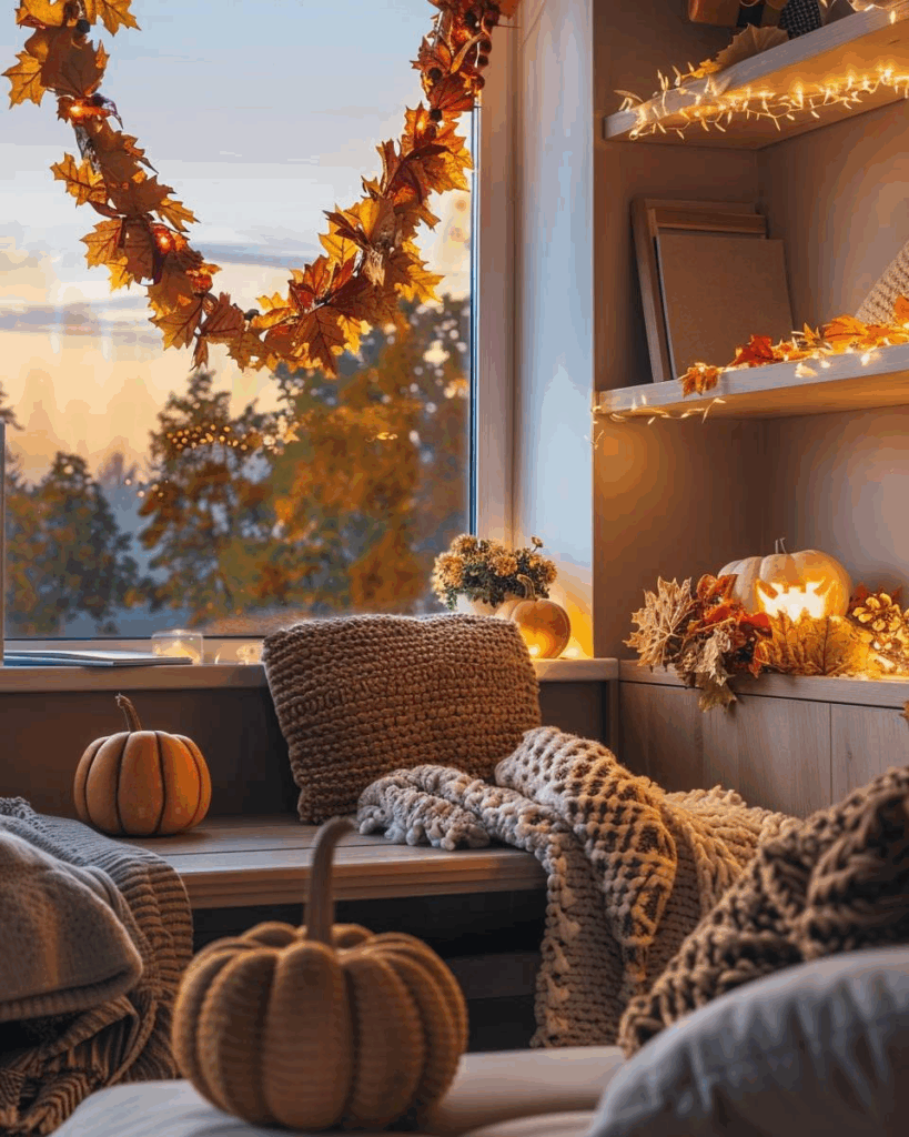 Bringe herbstliche Girlanden über Fenster und Regale an. Bunte Blätter, Zapfen und Eicheln geben jedem Raum sofort eine warme Stimmung. Wir nutzen dabei dünne Schnüre oder Draht, um alles sicher zu befestigen. So wirken Regal und Fenster richtig gemütlich und der Herbst zieht sichtbar ins Wohnzimmer ein.