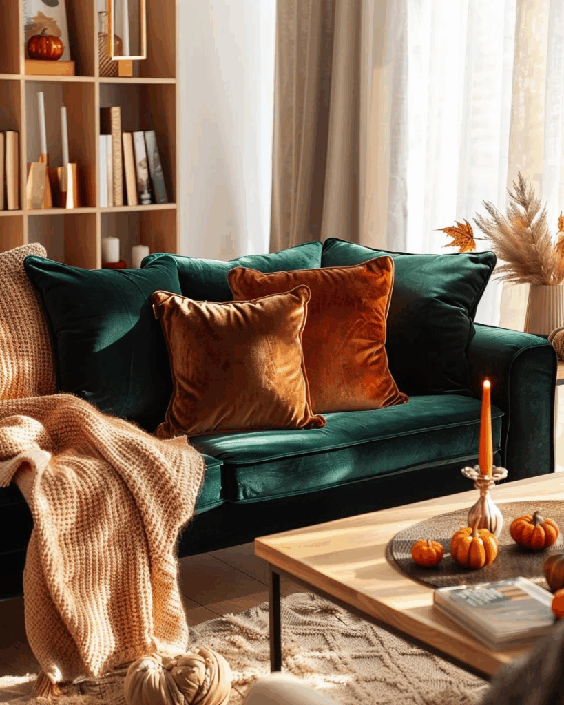 Bringe Farbe ins Wohnzimmer und lege Samtkissen auf dein Sofa. Samtkissen fühlen sich weich an und wärmen dich an kühlen Tagen. Wir wählen gedeckte Töne wie Rost, Senf oder Dunkelgrün. Kissen in unterschiedlichen Größen geben Tiefe und schaffen eine gemütliche Herbststimmung.