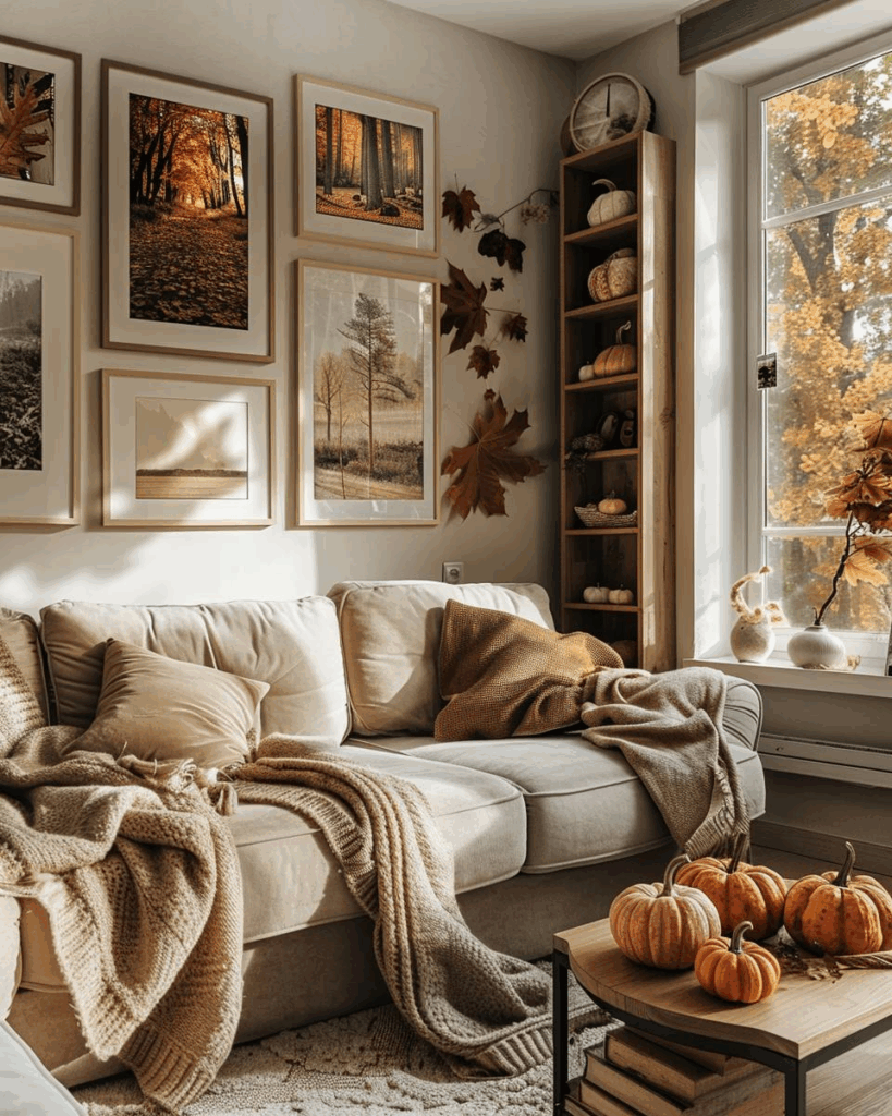 Gestalte Fotowände mit herbstlichen Naturmotiven, wie Blättern, Waldlandschaften und Ästen. Wir hängen Bilder mit unterschiedlichen Größen in enger Anordnung auf. Passe die Farbtöne der Bilder an die dekorierten Textilien im Wohnzimmer an. So passt die Fotowand zur restlichen Dekoration. Nutze Holzrahmen, um Wärme in den Raum zu bringen.