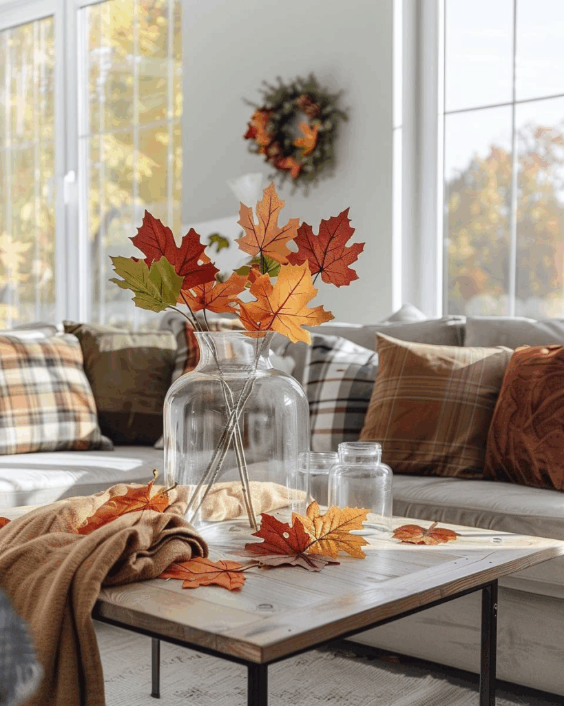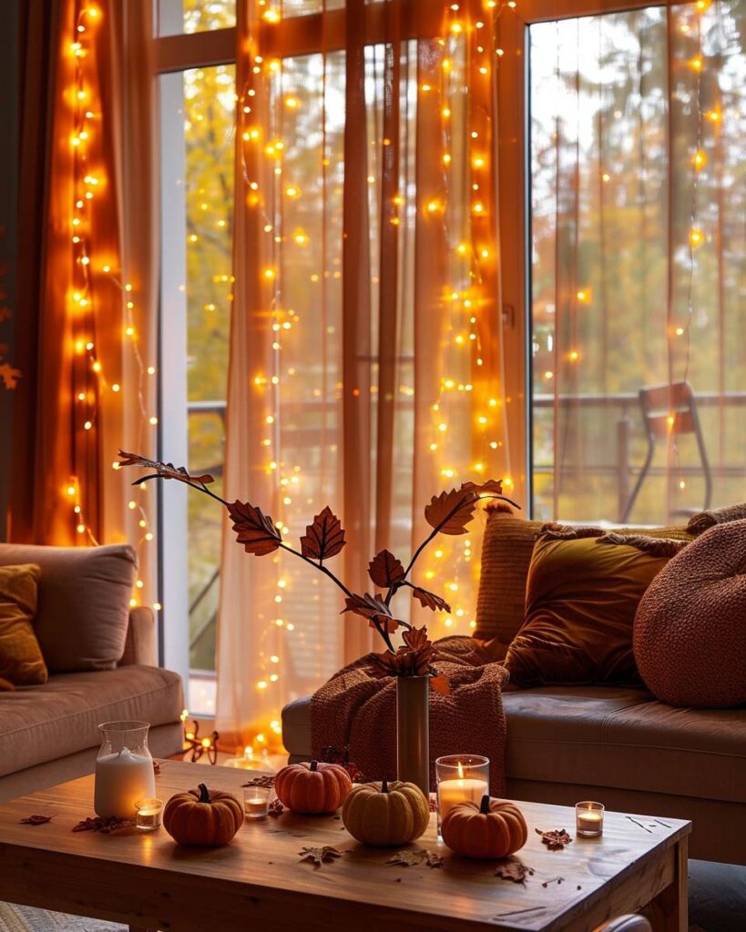 Hänge bunte Stoffgirlanden aus Filzblättern an dein Fenster. Nutze eine feste Schnur und befestige sie oben am Rahmen. Wähle warme Herbstfarben wie Rot, Orange und Gelb. So bekommt dein Wohnzimmer sofort herbstliche Stimmung.