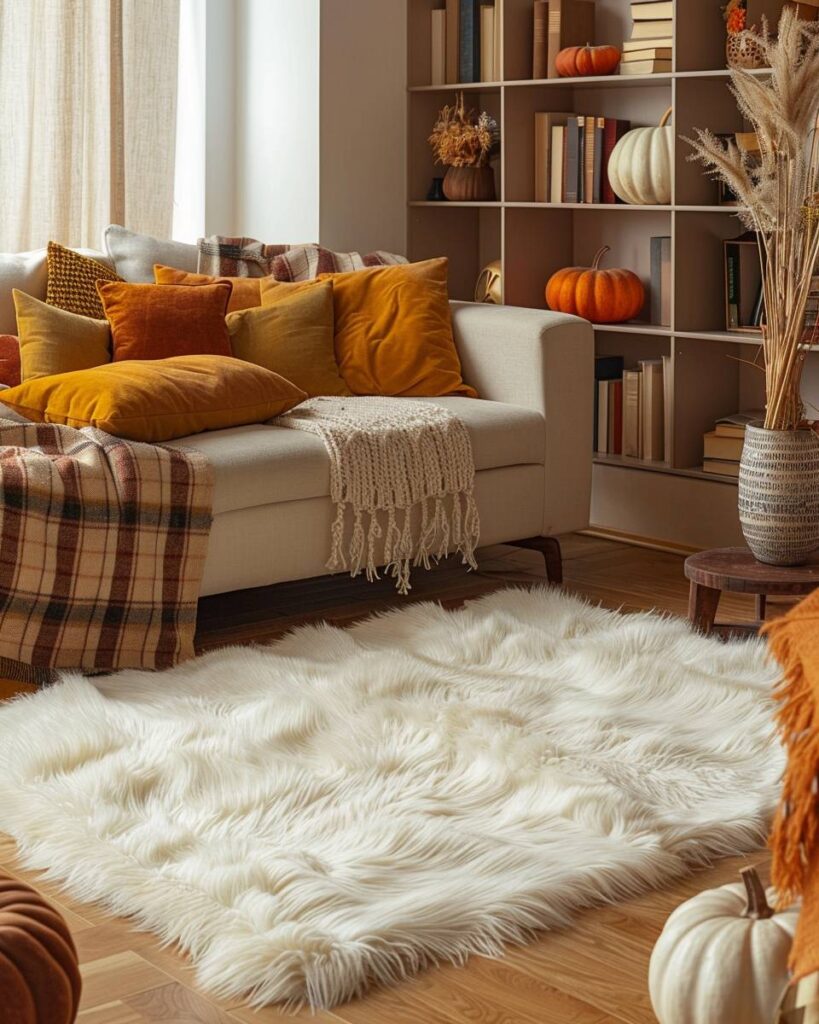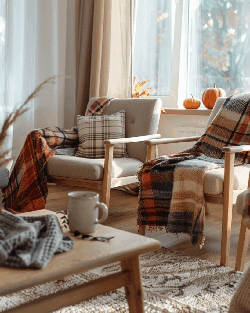 Wähle kuschelige Decken im Karo-Look für dein Wohnzimmer. Das Muster bringt Wärme und rustikale Gemütlichkeit in den Raum. Lege die Decken auf Sofa oder Sessel. Natürliche Farben wie Braun, Rot oder Senfgelb passen perfekt zum Herbst.