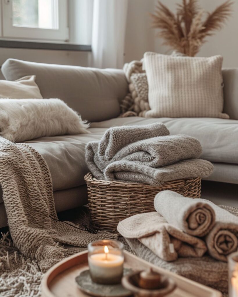 Stapel Decken in einem Rattan-Korb neben dein Sofa. Der Korb ist stabil und sieht natürlich aus. Die Decken sind sofort griffbereit und wirken als herbstliche Dekoration. So bleibt dein Wohnzimmer ordentlich und warm.