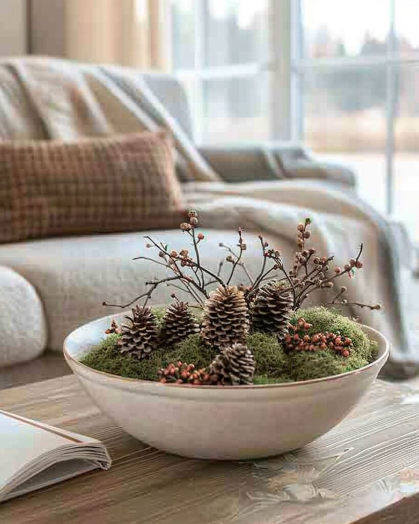 Lege Tannenzapfen auf das Sideboard oder arrangiere sie in einer flachen Schale. Streue einige Zapfen auf den Couchtisch oder die Fensterbank. Ergänze Moos und kleine Zweige, um die herbstliche Stimmung zu verstärken. Tannenzapfen sind robust und bringen sofort natürliche Gemütlichkeit ins Wohnzimmer.