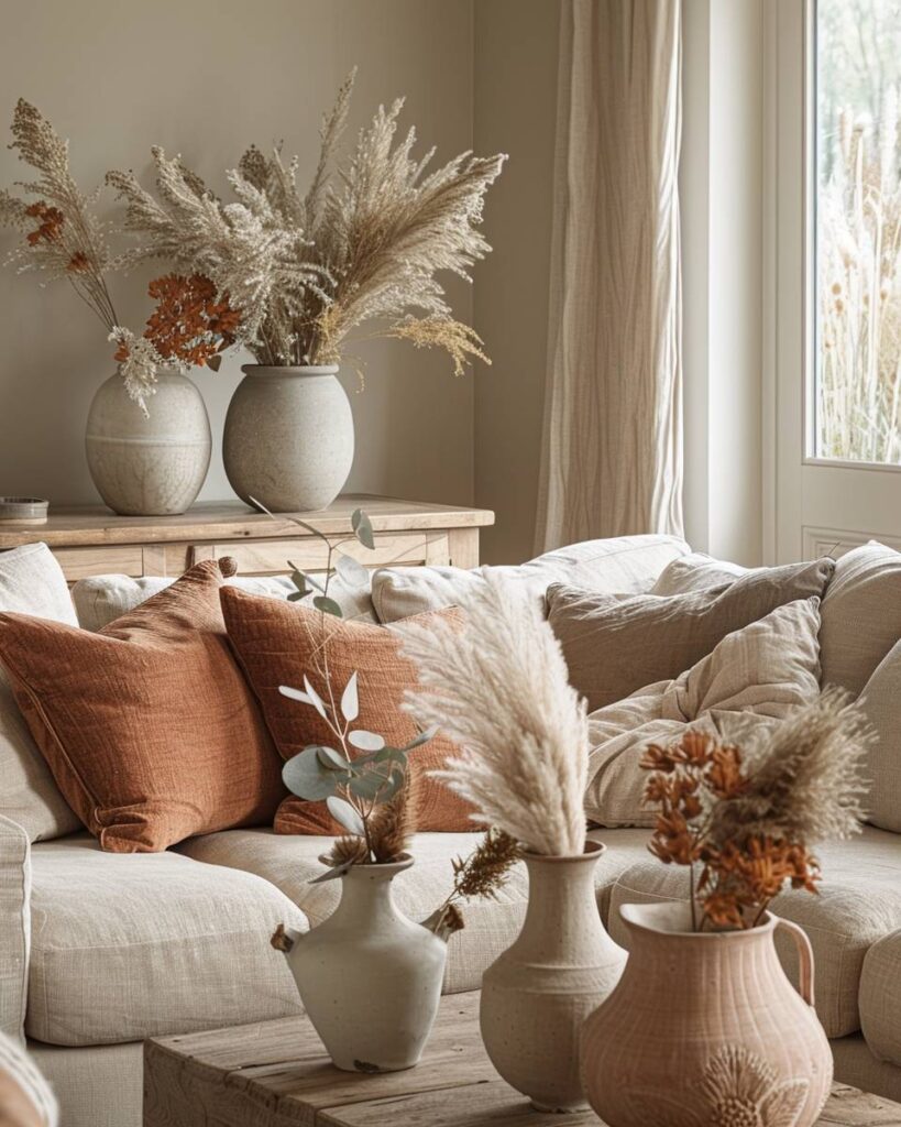 Stelle Vasen mit getrockneten Gräsern wie Pampasgras, Schilf oder Hafer auf deinen Tisch oder dein Regal. Gläserne oder schlichte Keramikvasen bringen die natürliche Struktur der Gräser zur Geltung. Ergänze wenige Herbstblätter für mehr Farbe. Die Gräser halten lange und bringen sofort Gemütlichkeit ins Wohnzimmer.