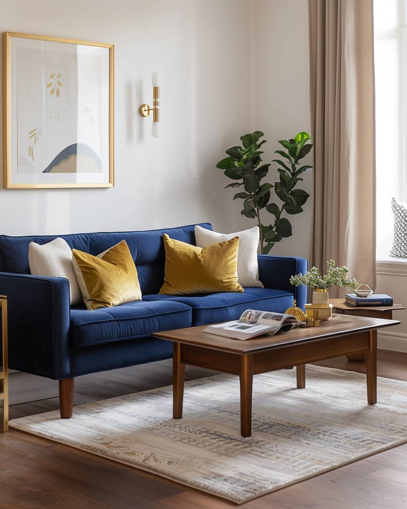 Wähle goldene Dekokissen als Highlight. Die Farbe passt perfekt zu einem blauen Sofa. Gold bringt Wärme ins Wohnzimmer. Mit flauschigen Stoffen wirken die Kissen gemütlich und edel. Platziere sie auf dem Sofa, um Farbe und Glanz gezielt zu setzen.