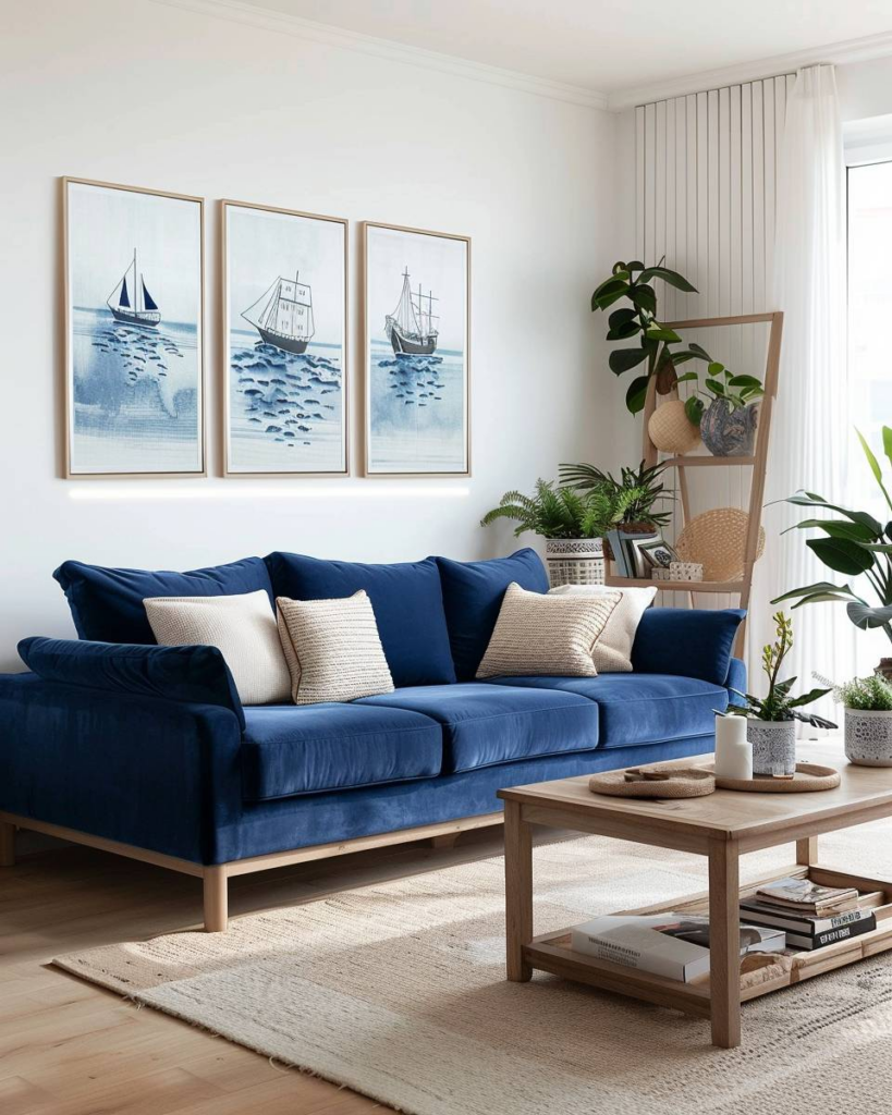 Such dir Maritime Bilder wie Strandmotive, Schiffsansichten oder Meereslandschaften. Ruhige Blautöne passen super zu einem blauen Sofa. Nutze helle Rahmen und lichte Motive, um das Zimmer frisch zu halten.