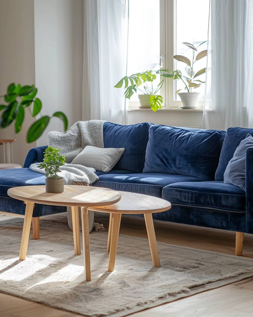 Wähle einen Holz-Couchtisch zum blauen Sofa. Holz bringt Wärme, Blau wirkt frisch. Couchtische aus Eiche, Buche oder Nussbaum setzen einen angenehmen Kontrast. Setze auf schlichte Modelle, so bleibt das Sofa im Mittelpunkt.