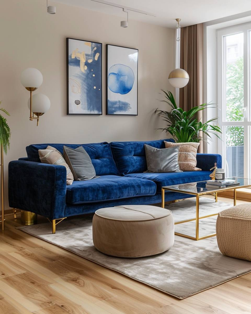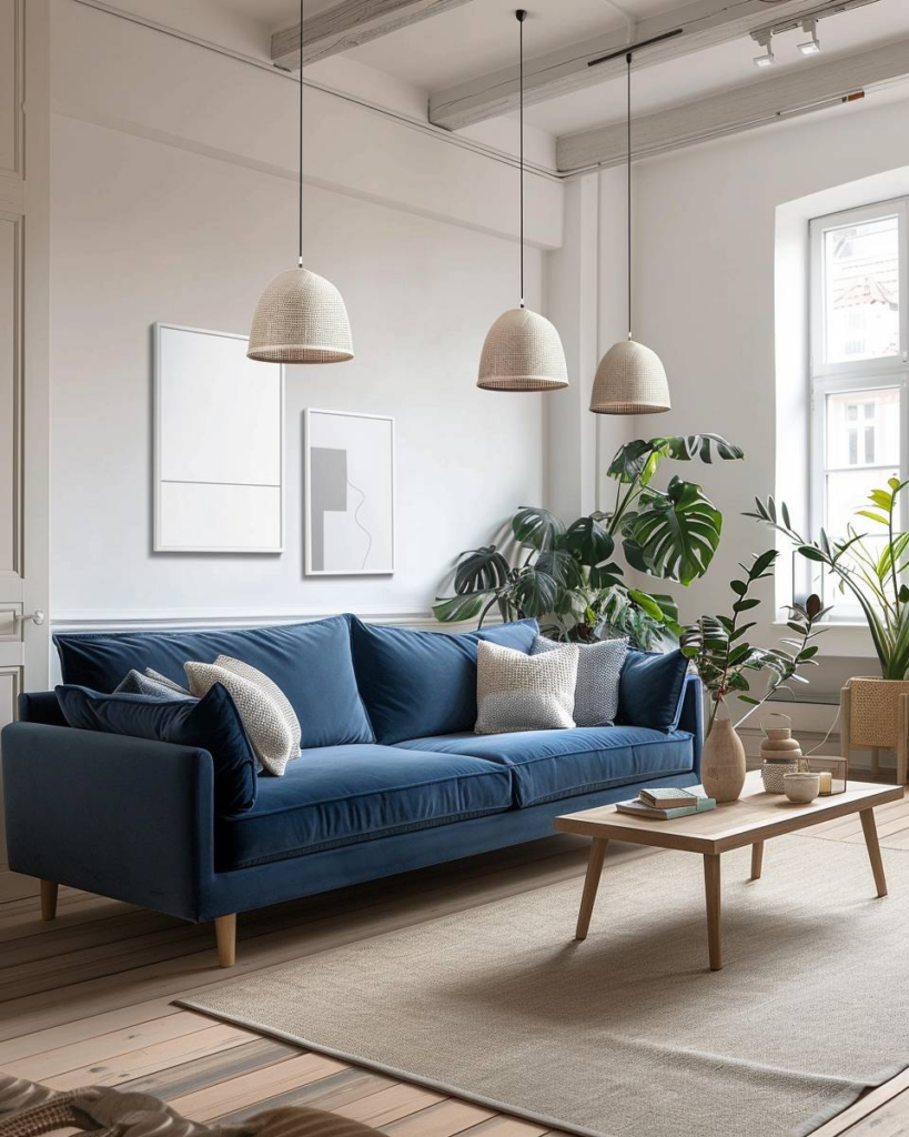Bringe große Pendelleuchten über deinem blauen Sofa an. Warmes Licht schafft eine ruhige Atmosphäre und setzt Akzente. Wähle Lampenschirme aus Glas oder Stoff. Dimmbares Licht hilft uns, den Raum flexibel zu gestalten.
