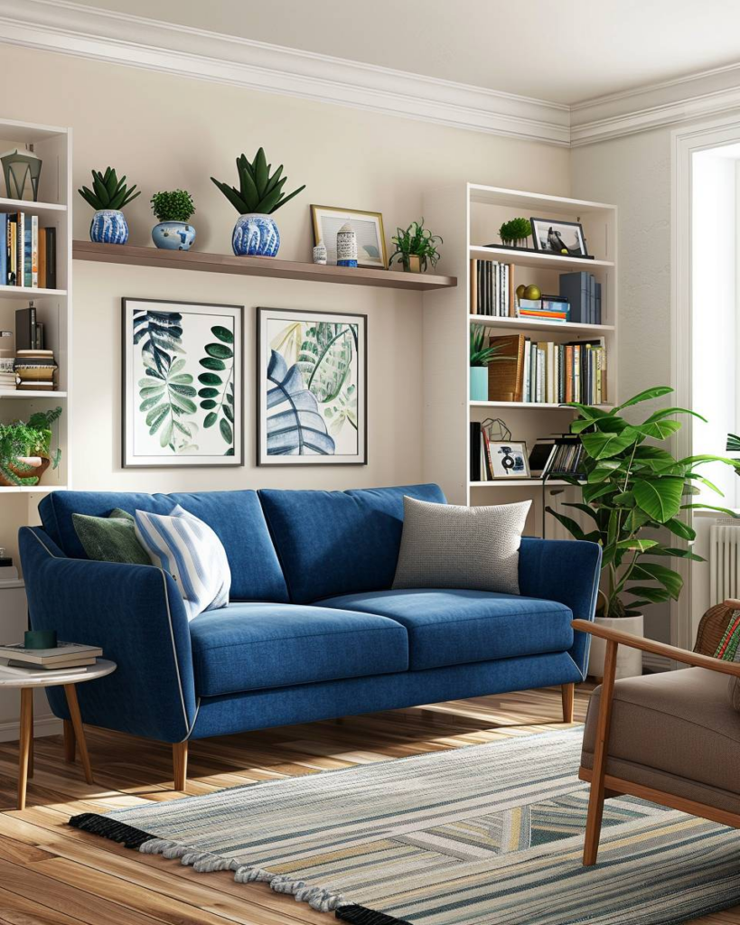 Bücher zeigen auf offenen Regalen neben einem blauen Sofa macht dein Wohnzimmer lebendig. Holzregale bringen Wärme, während Metallregale modern wirken. Farbsortierte Buchrücken passen zu Blautönen und lassen den Raum harmonisch aussehen. Pflanzen neben den Büchern geben frische Akzente.