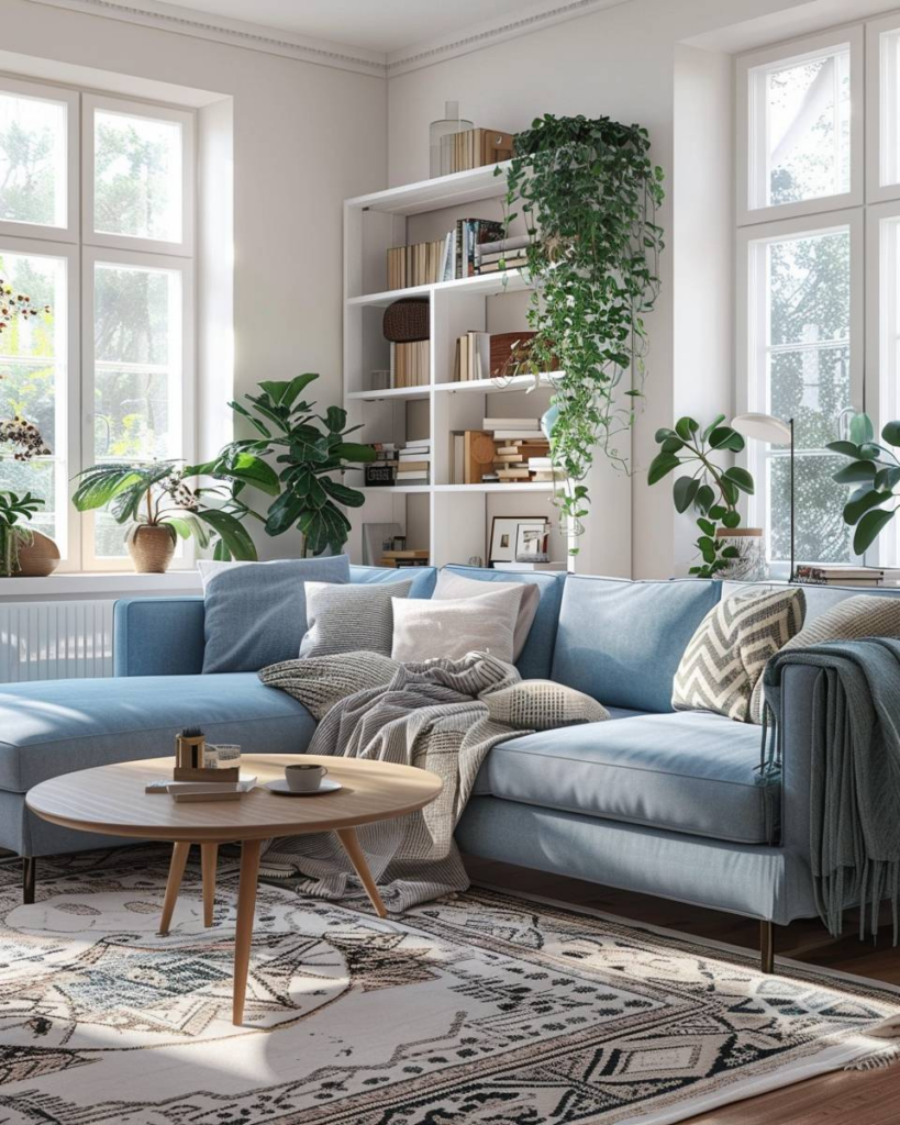 Leg einen gemusterten Teppich unter das blaue Sofa. Muster lockern die Optik auf. Farben wie Grau, Beige oder Weiß passen fast immer. Ein geometrisches Design bringt Ruhe, florale Muster sorgen für Gemütlichkeit. Der Teppich verbindet Sitzfläche und Tisch zu einer Einheit.