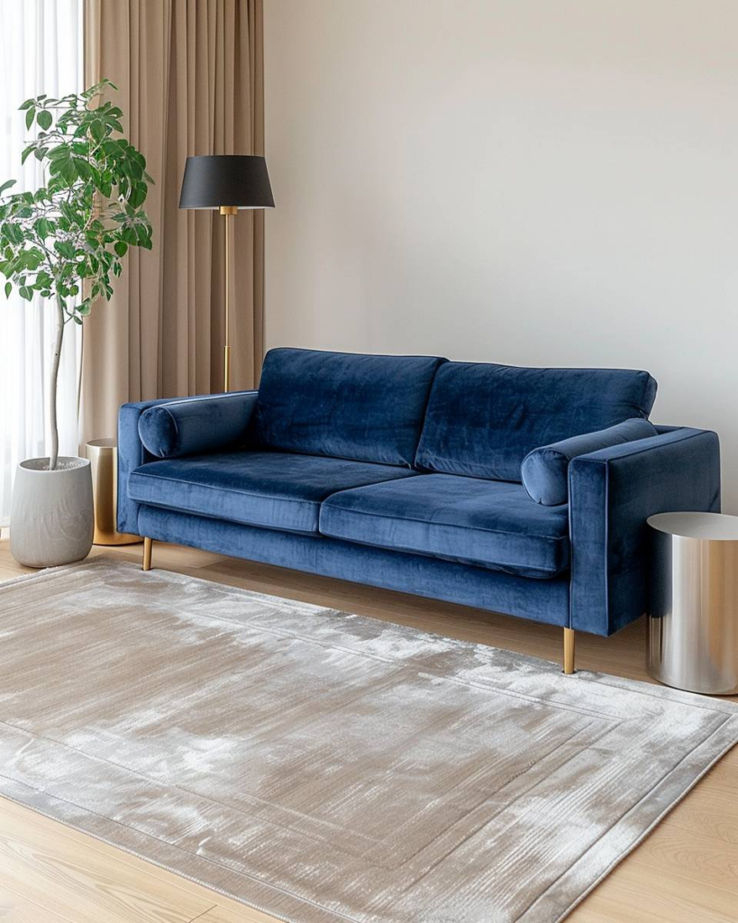 Mit goldenen Dekokissen als Akzent, einem gemusterten Teppich und Pflanzen bringst du das blaue Sofa optimal zur Geltung.