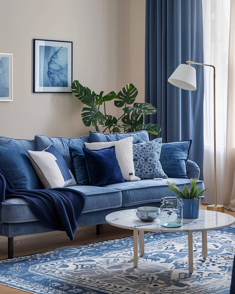 Spiele mit verschiedenen Blautönen bei Kissen, Teppichen und Vorhängen. Setze auf ein Mix aus Hellblau, Dunkelblau und Türkis. Nutze unterschiedliche Stoffe wie Samt, Leinen oder Baumwolle. So wirkt dein Wohnzimmer stimmig und lebendig.
